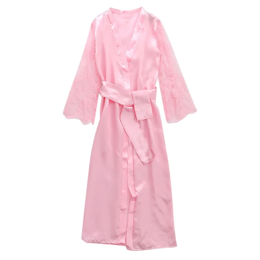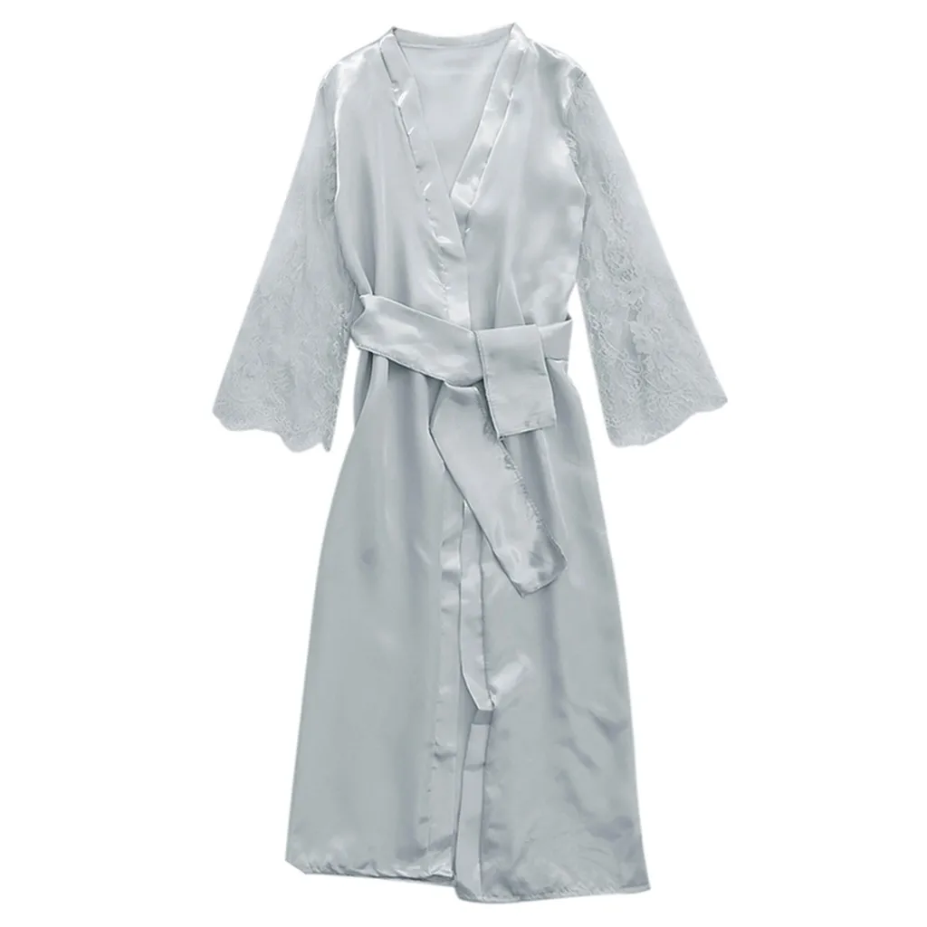 Women Satin Silk Long Nightdress Lady Sleeping Gown Cardigan Lady Pajamas Sexy Hollow Lace Comfortable Nightgown for Bedroom