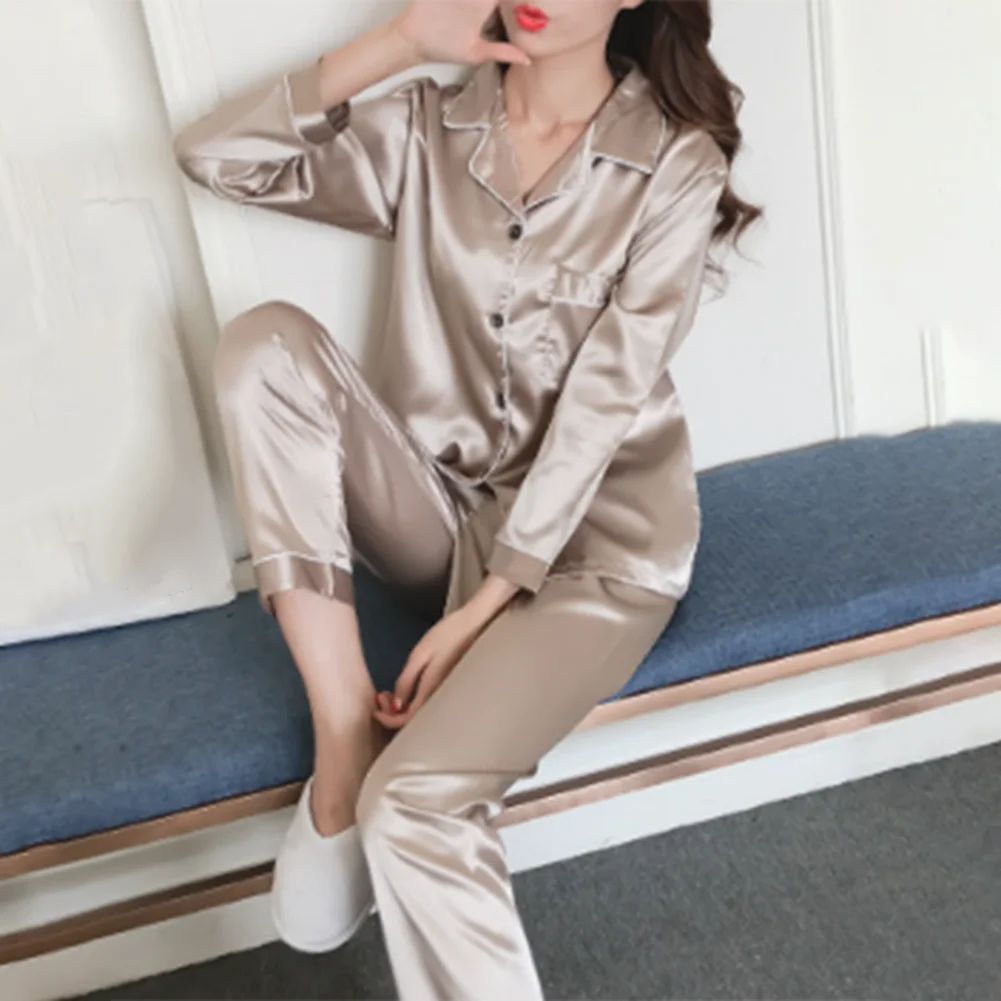 Women Satin Long Sleeve Pajama Set Lapel Top And Pants Comfortable Solid Pajamas Loungewear 2024 New Arrival Drop Shipping