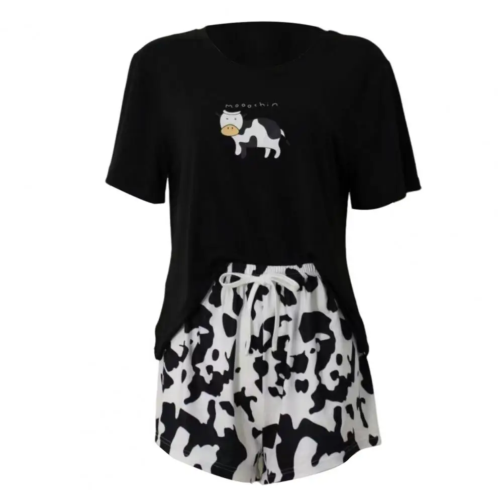 2 Pcs/Set Women Pajamas Set Short Sleeve O Neck T-shirt Drawstring Elastic Waist Short Pants Homewear Top Shorts Set