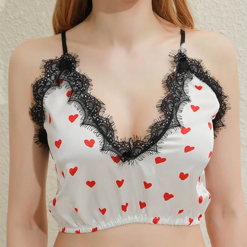 Lace Satin Cami Print Heart Shorts Women Pijamas Sexy Sleepwear Set Eyelash 2021 Spring Summer Ladies Short Set Nightwear 2 PCS