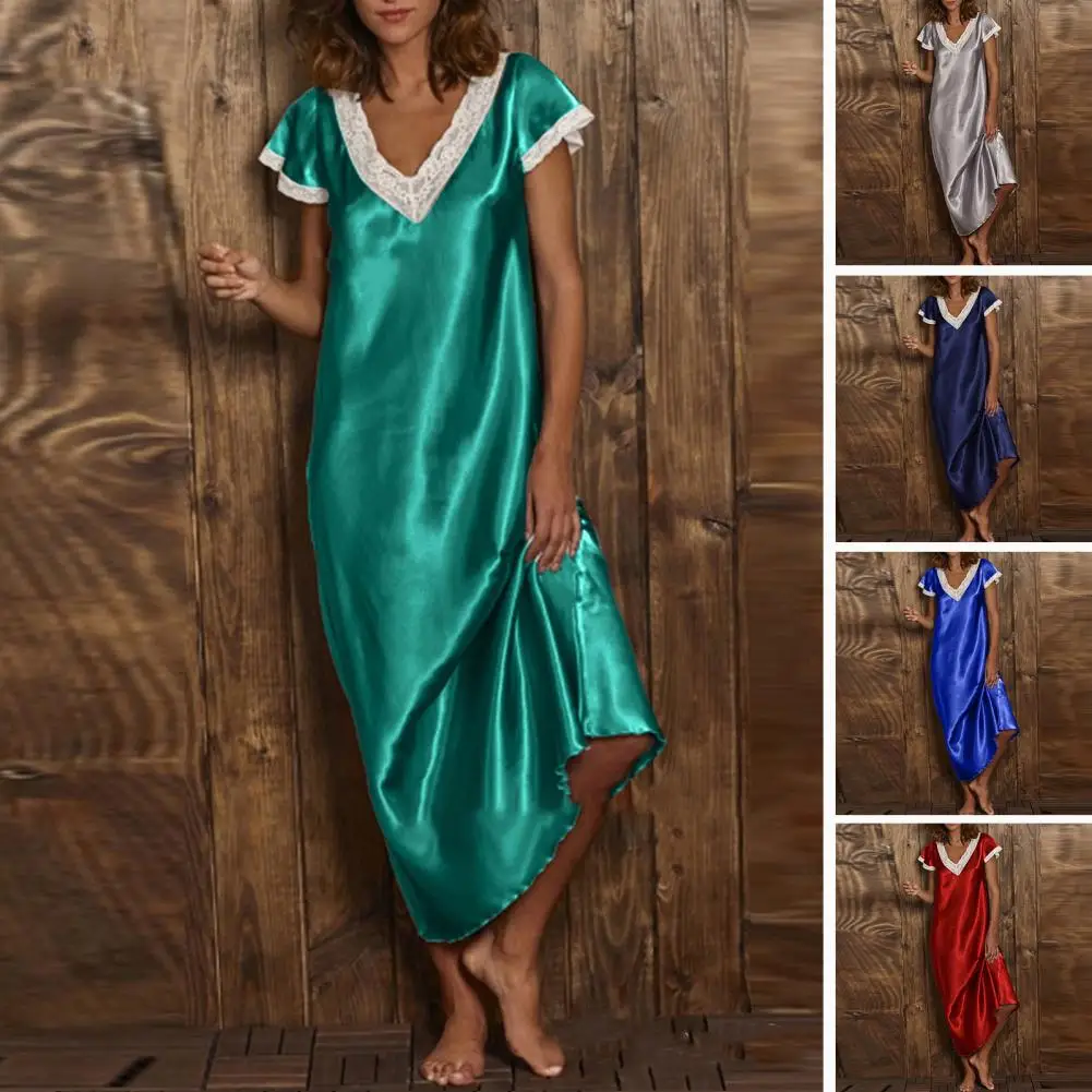 Women V-Neck Lace Stitching Sleeping Dress Short Sleeve Loose Nightdress Smooth Satin Midi Nightgown