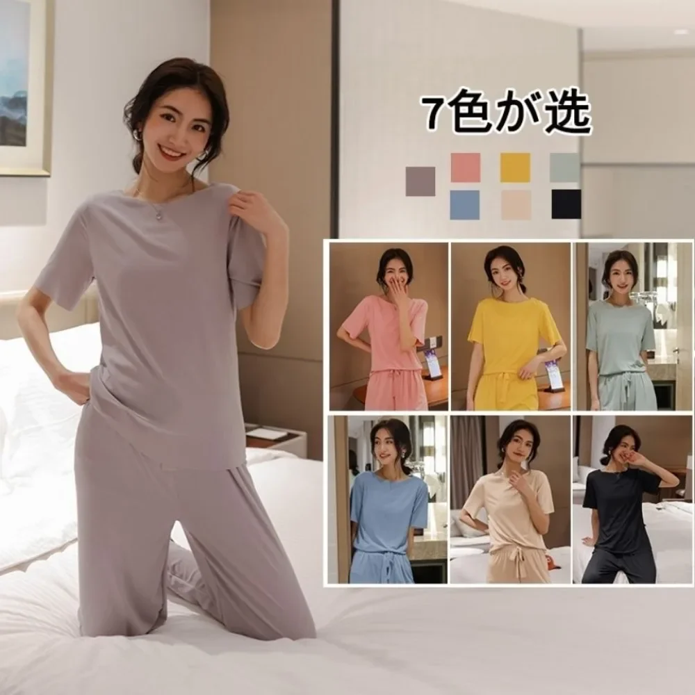 Korean Version Summer Thin Solid Color Home Clothing Two-piece Set with Short Sleeves, Elastic Waist, Long Pants, Lazy Pajamas