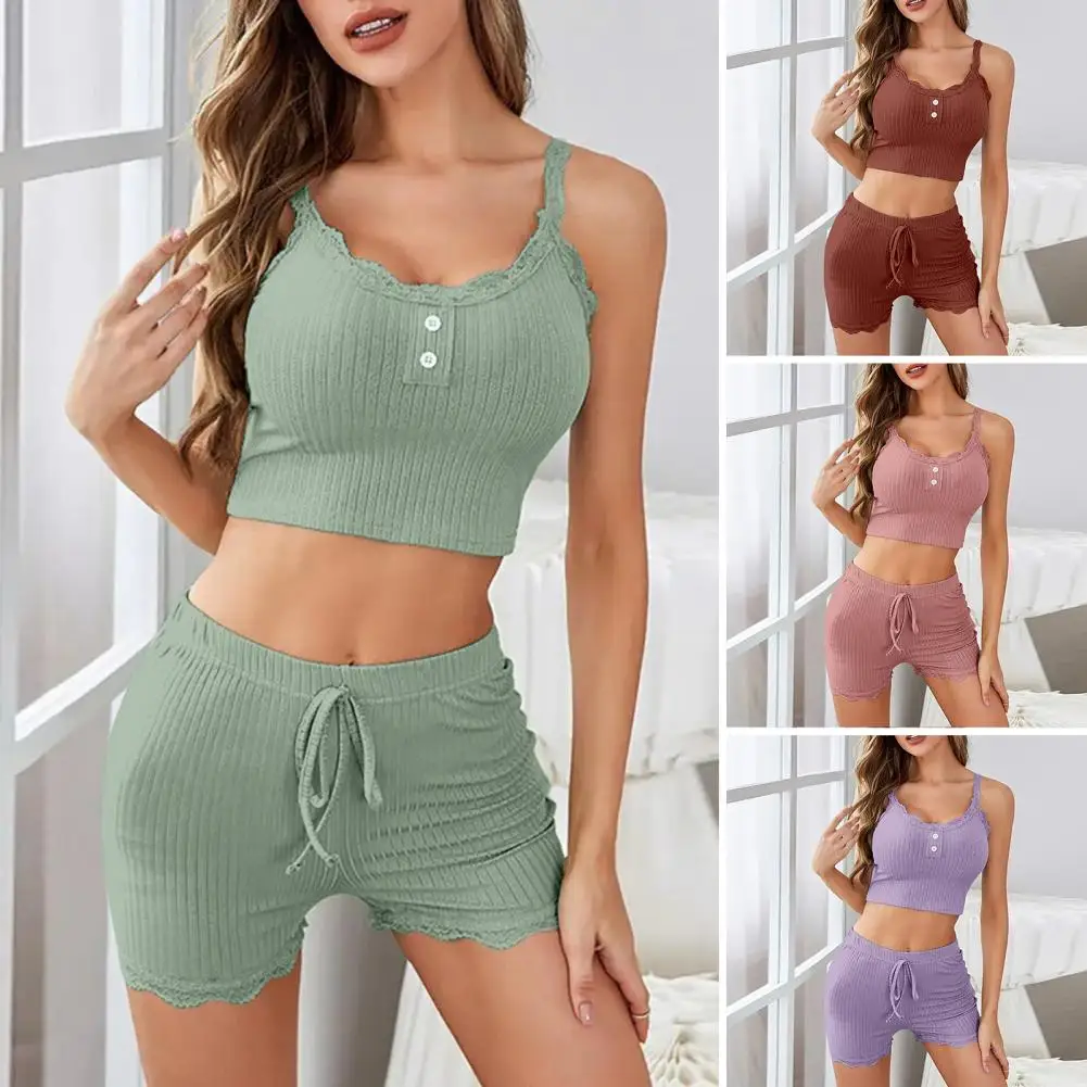 Summer Pajamas Set Elegant Lace V Neck Top High Waist Shorts Set for Women Summer Pajamas Outfit with Drastring Elastic Slim Fit