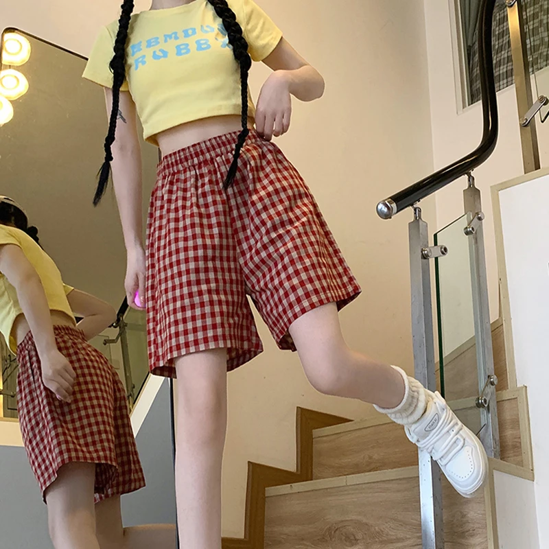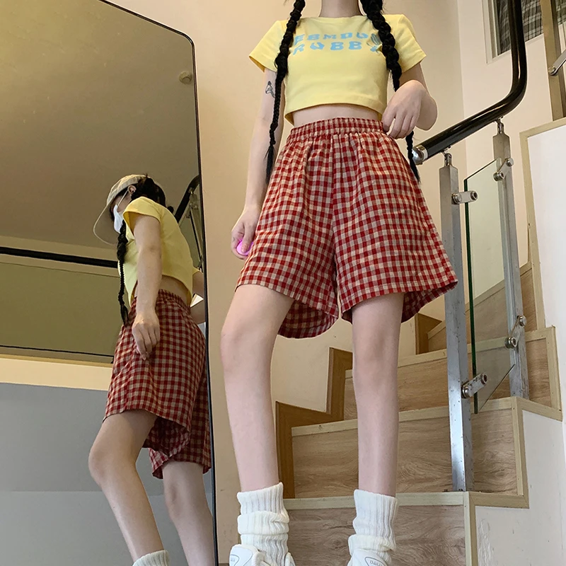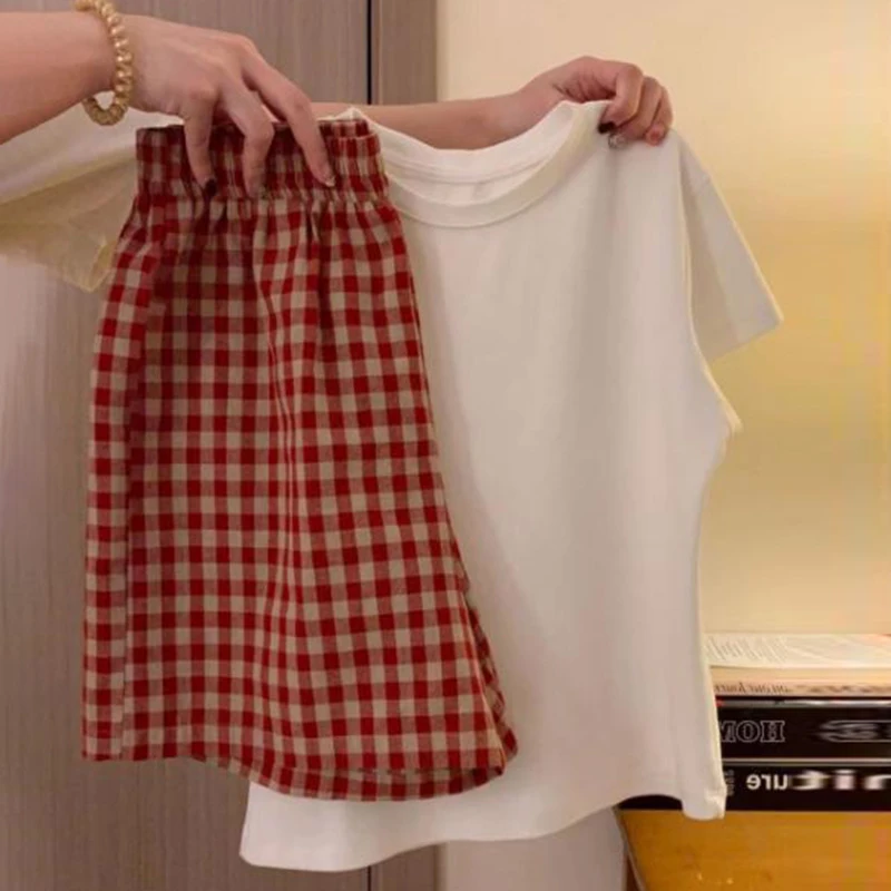 Fashionable And Casual Loose Home White T-Shirt + Plaid Shorts Two-Piece Set