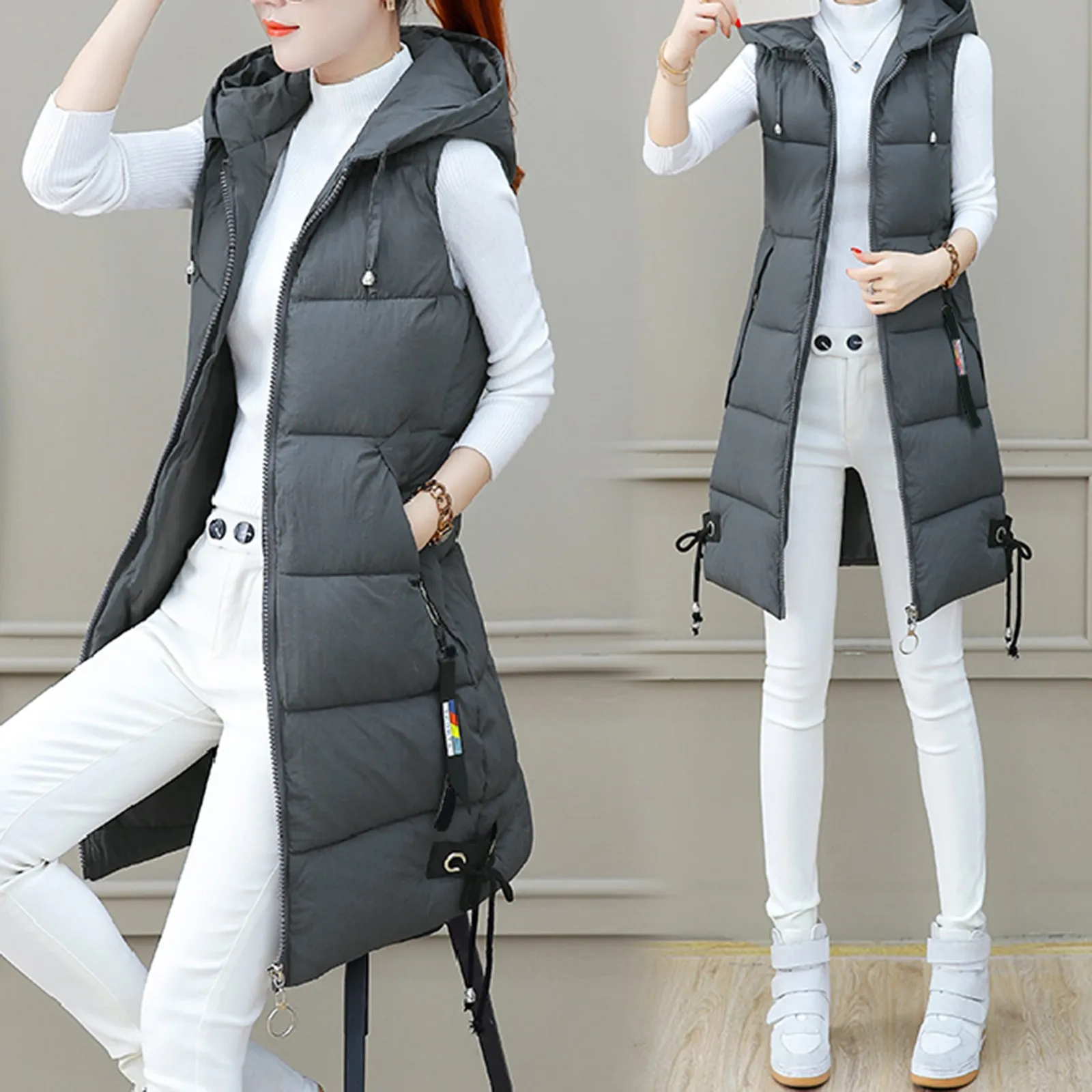 Women Casual Solid Coat Hooded Vest Zipper Pocket Loose Sleeveless Knee-Length Long Coat Winter Plain Keep Warm Down Jacket