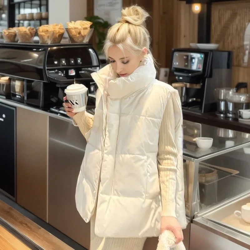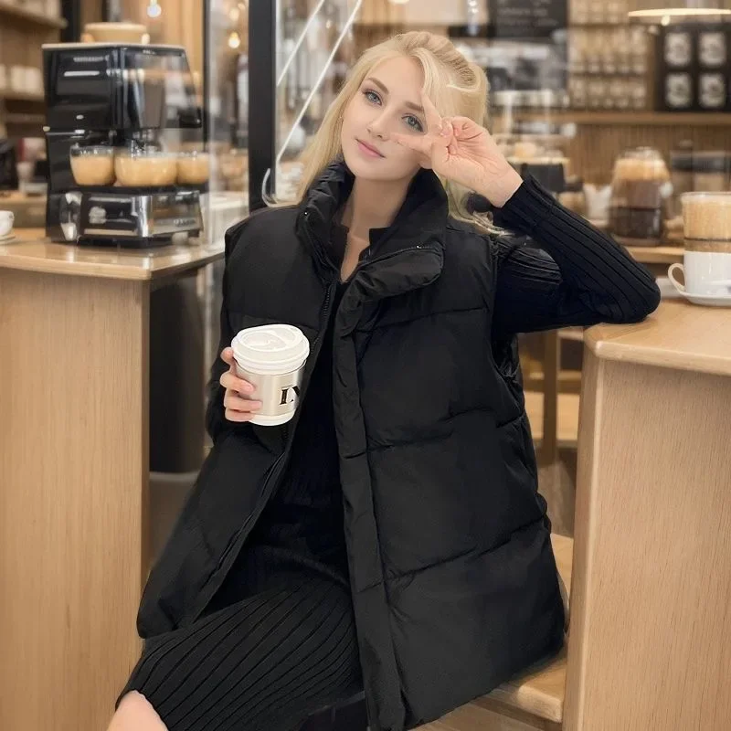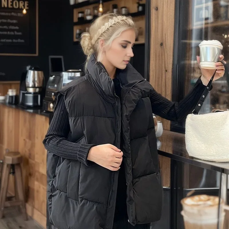 Winter Korean Fashion Vests Down Jacket for Women Autumn New Casual Sleeveless Loose Parkas Chic Stand Collar Black Coats