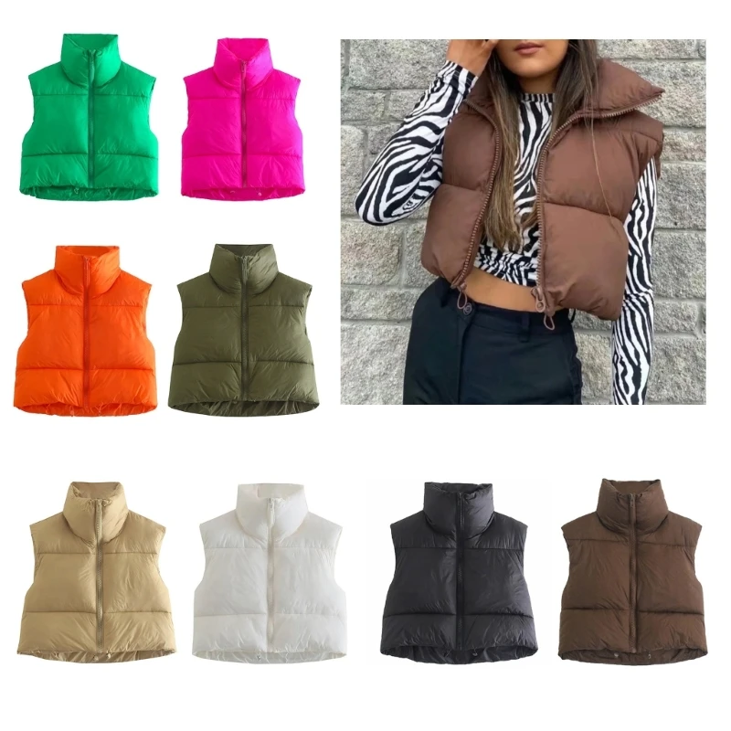 Women Winter Waistcoat Lightweight Sleeveless Stand Collar Zipper Up Crop Puffer Vest Outwear Solid Quilted Padded Dropship