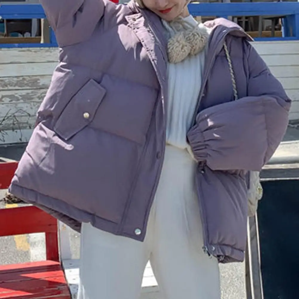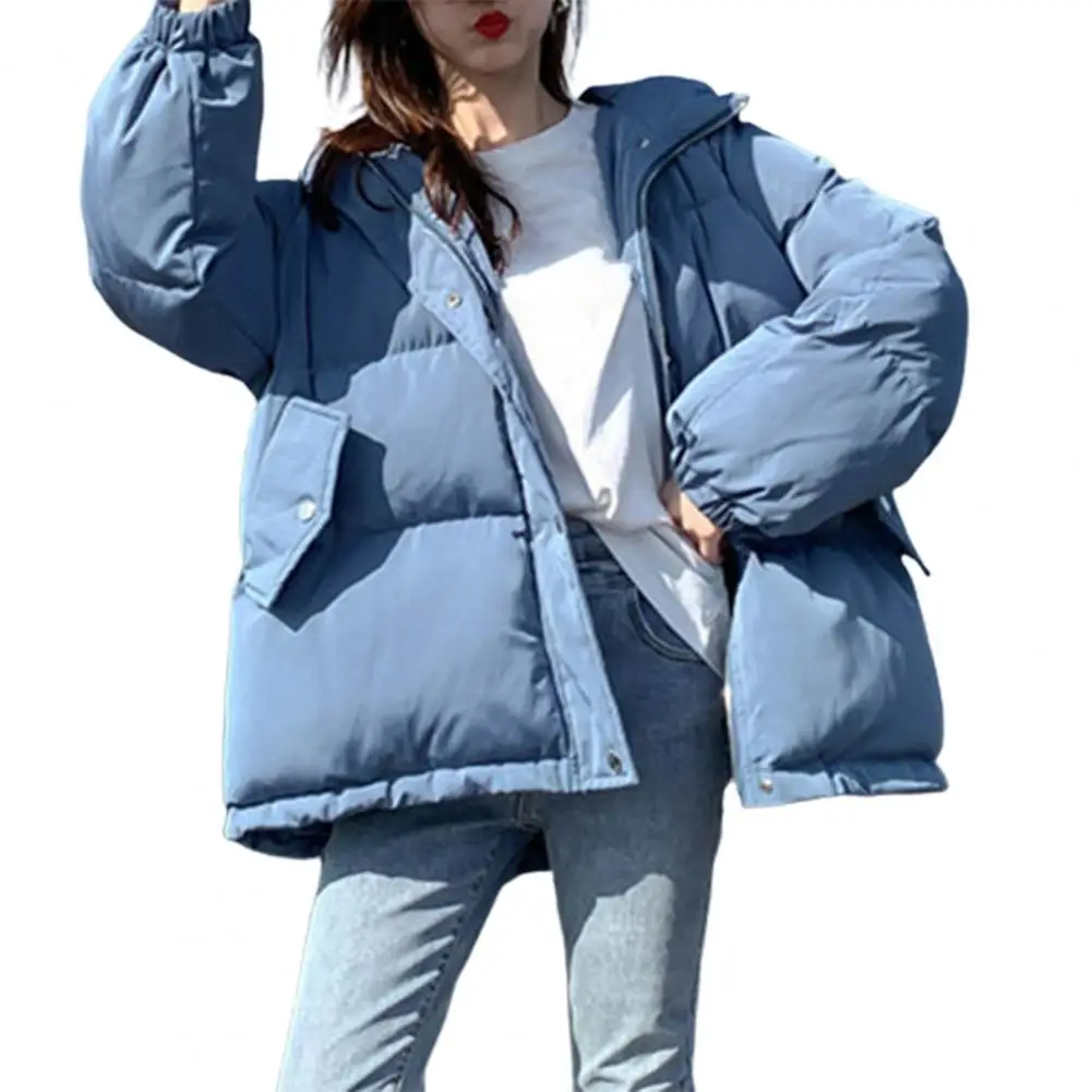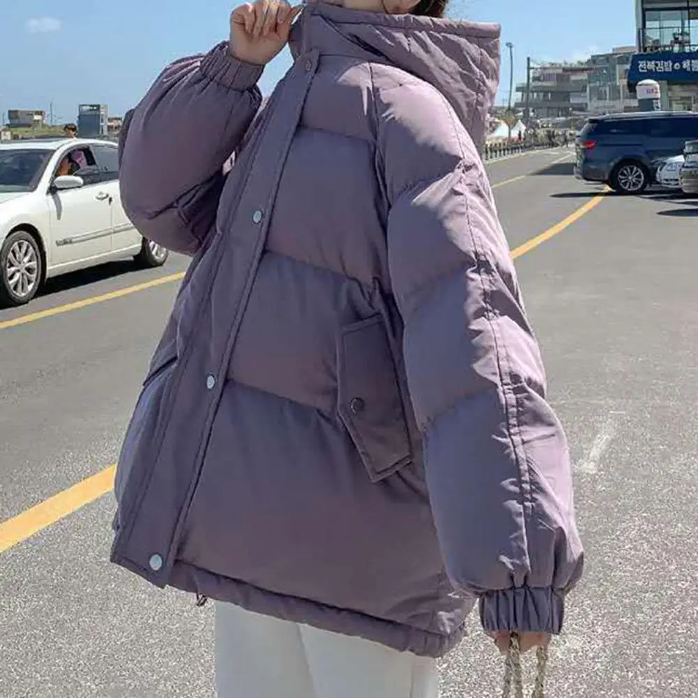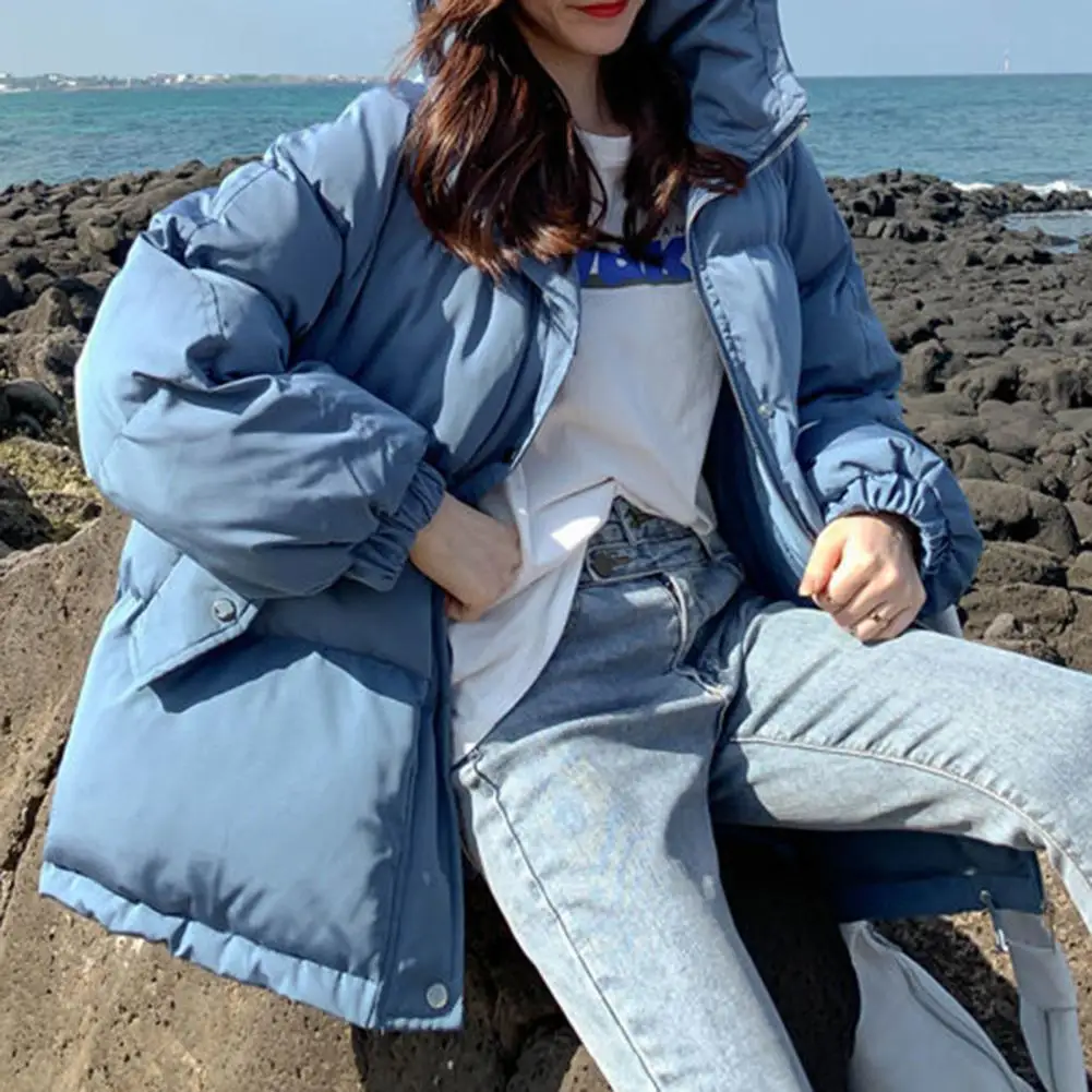 Solid Color Hooded Women Coat Shrinkable Cuff Cotton Coat Zipper Closure Long Sleeve Pockets Jacket Coat Outerwear