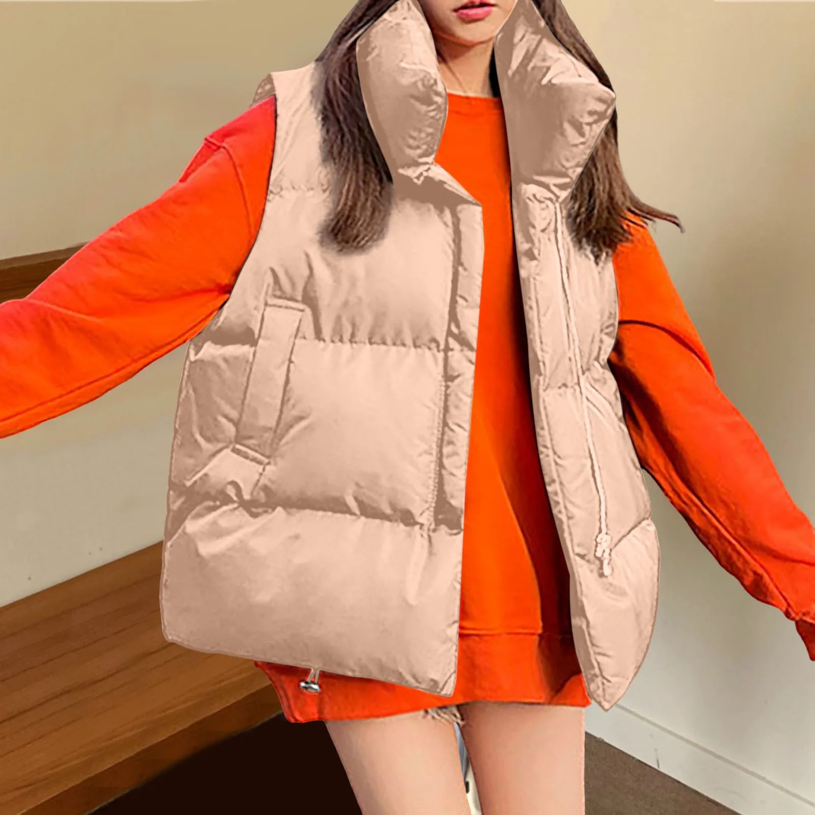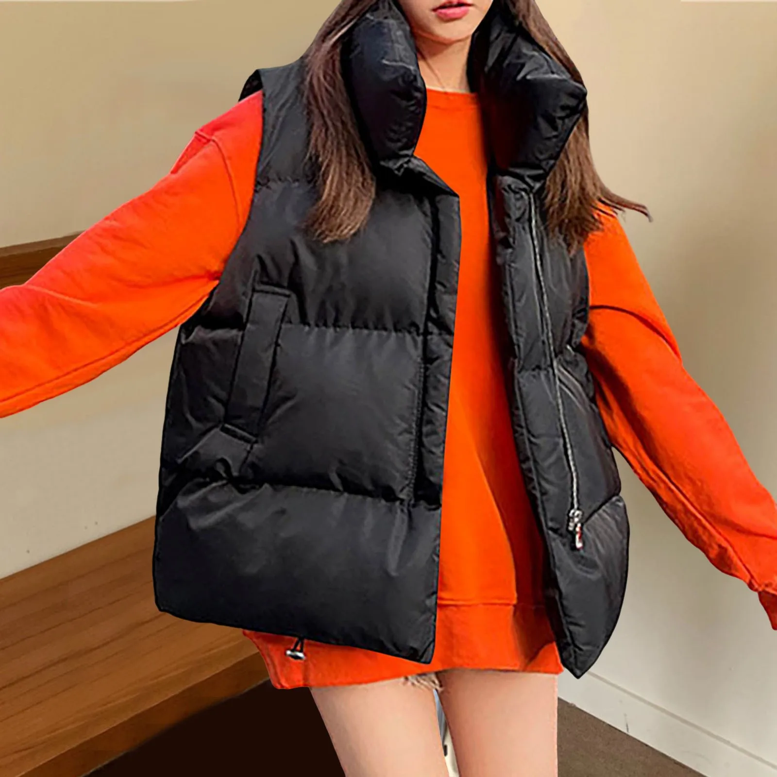 Winter Warm Lightweight Casual Outerwear Vest Women Loose Fit Solid Color Jacket Vest Stand Collar Pockets Fashion Vest Coat