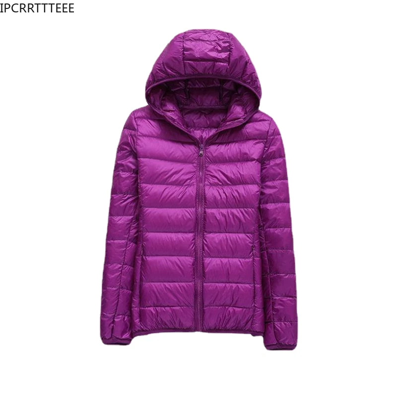 Autumn Winter Women Solid Thin Stand Collar Hooded Fashion Slim Down Coat White Duck Down Jacket