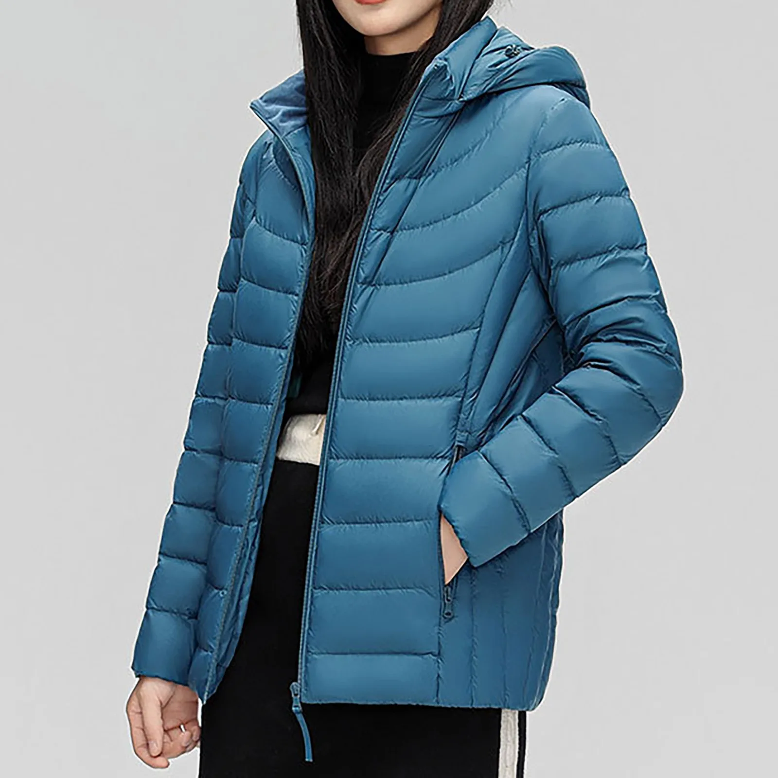 New Lightweight solid color Hooded Down Jacket Stand Collar Plus Size loose Down Coat casual zipper pocket down Jackets Women