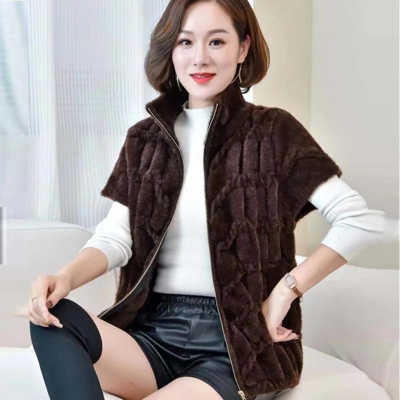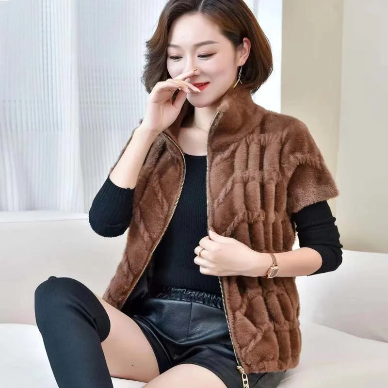 Lnternet Celebrity New Imitation Mink Fur Knitted Cardigan Women's spring Autumn Vest Mother's Short Sleeved Shawl Zipper Jacket