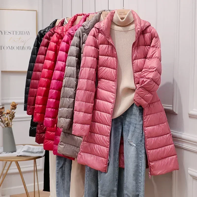 Light Thin Long White Coat Autumn Winter Portable Windproof Hooded Puffer Down Jacket Women Casual Double Zipper