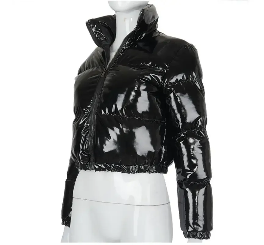 Fashion Women Bright PU Puffer Jacket Winter Warm Thick Bubble Coat Zipper Glossy Leather Down Parka Outerwear Loose Pink Jacket