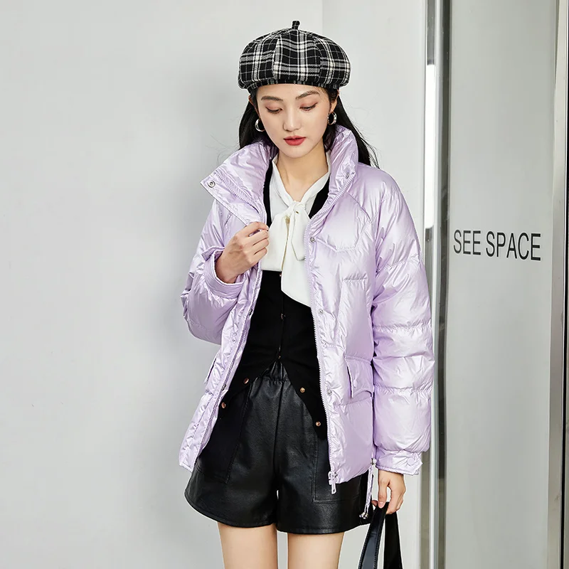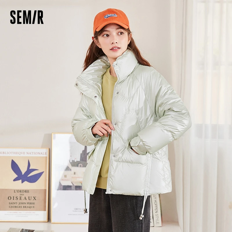 Semir Down Jacket Women Shiny Stand Collar Design 2023 Winter New White Duck Down Drawstring Loose Jacket