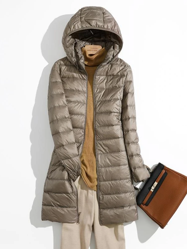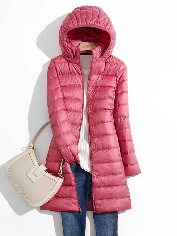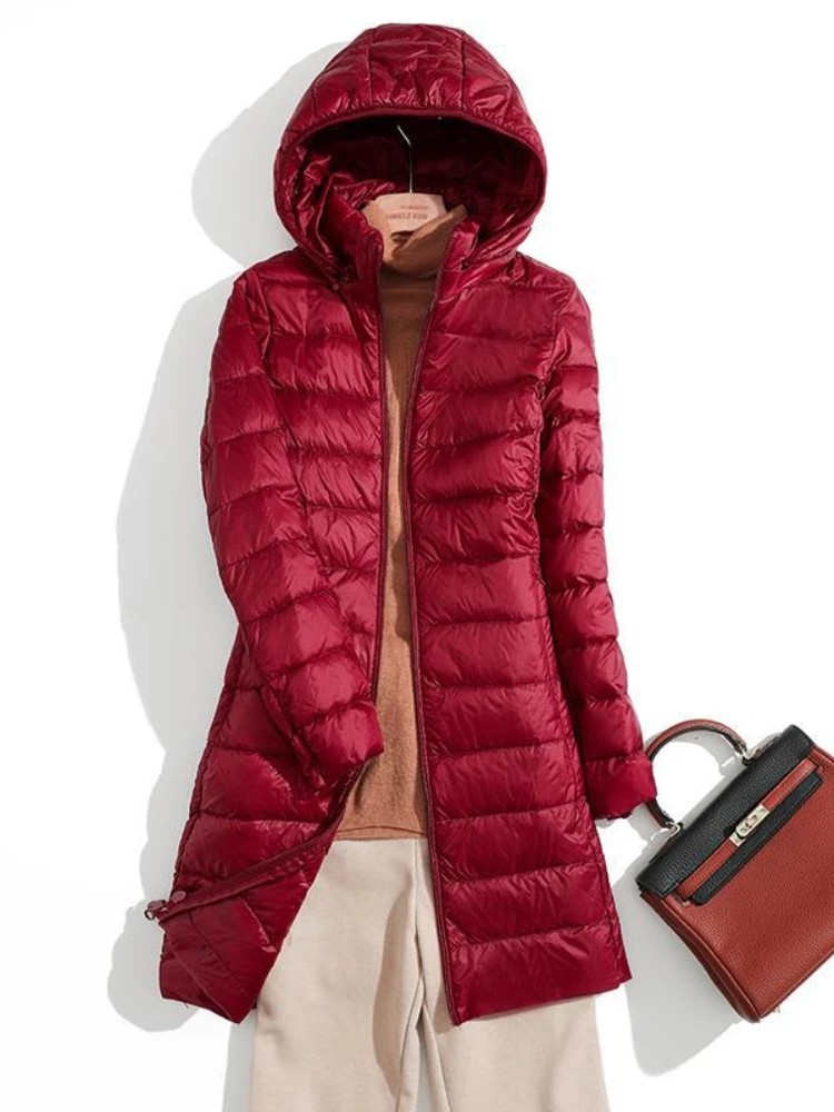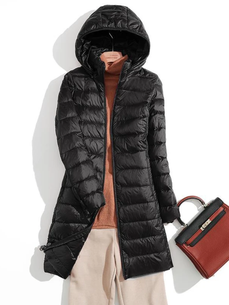 Women Winter Hooded Down Jacket Hat Detachable Coat Light Thin White Duck Parka Female Mid length Long Warm Slim Puffer Outwears