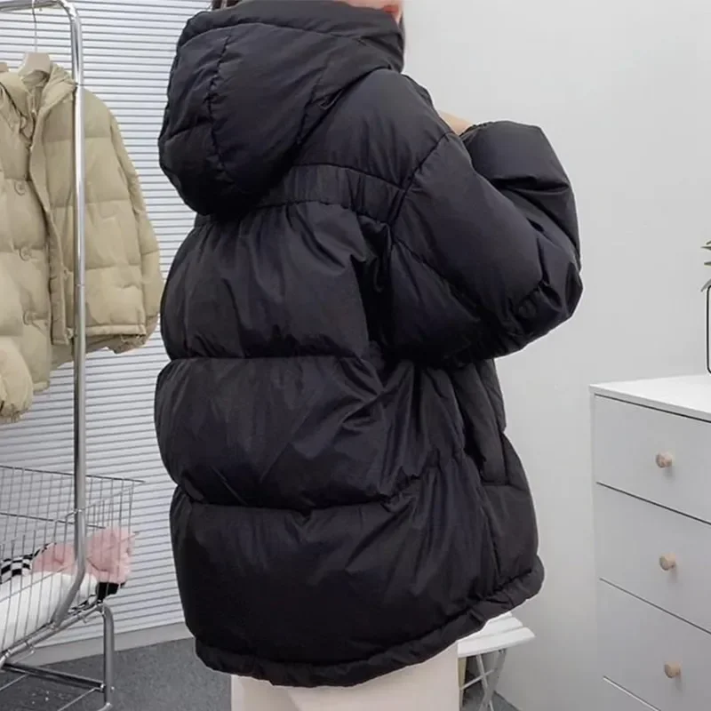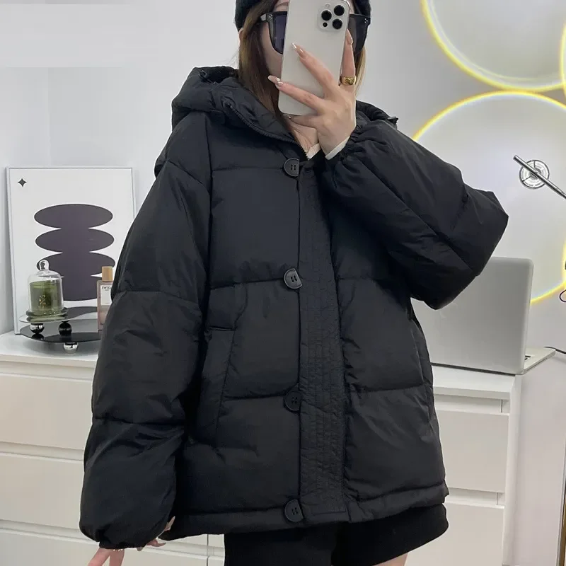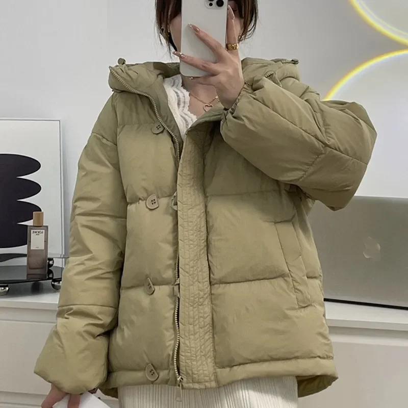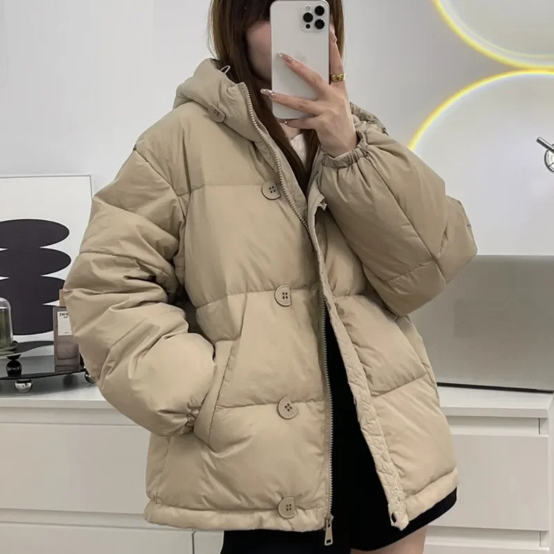 Solid Color Loose Casual Short Down Jacket Thicken Hooded White Duck Down Jacket 2023 Winter Pocket Button Zipper Down Jacket
