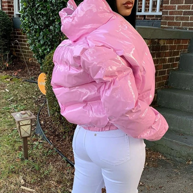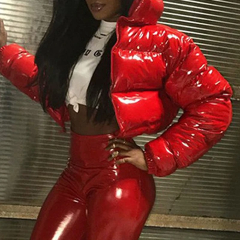 Women Winter Long Sleeve Zipper Puffer Jacket Stand Collar Shiny Metallic Faux Leather Cropped Puffy Bubble Coat Quilted Parkas