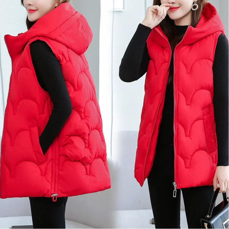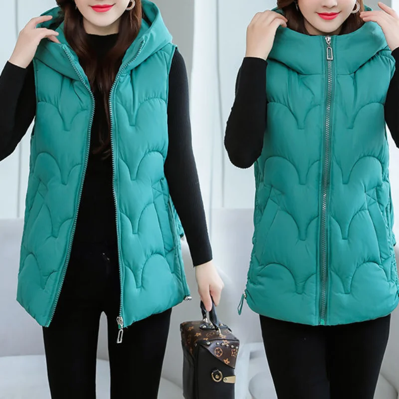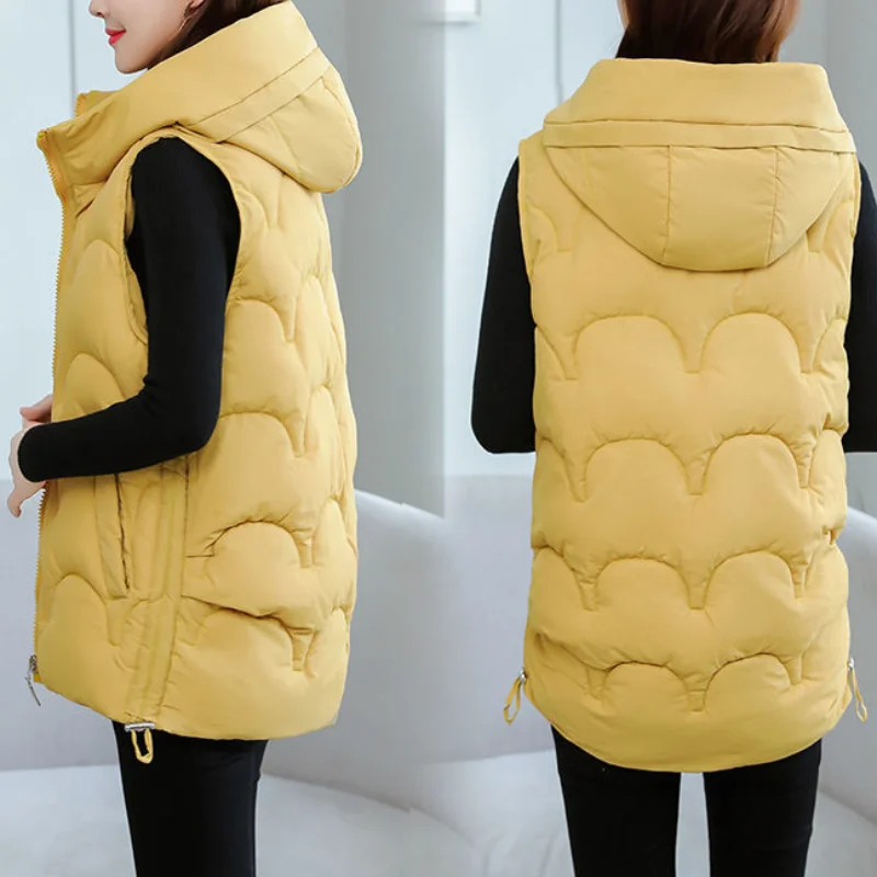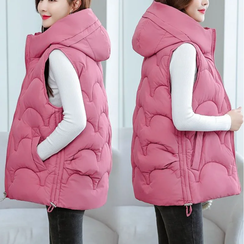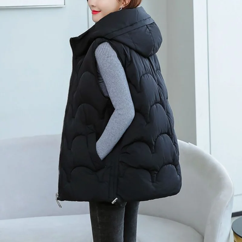 2024 Autumn Winter Korean Edition Solid Color Casual Warm Women Clothing Zipper Hooded Simplicity Sleeveless Cotton Clothes