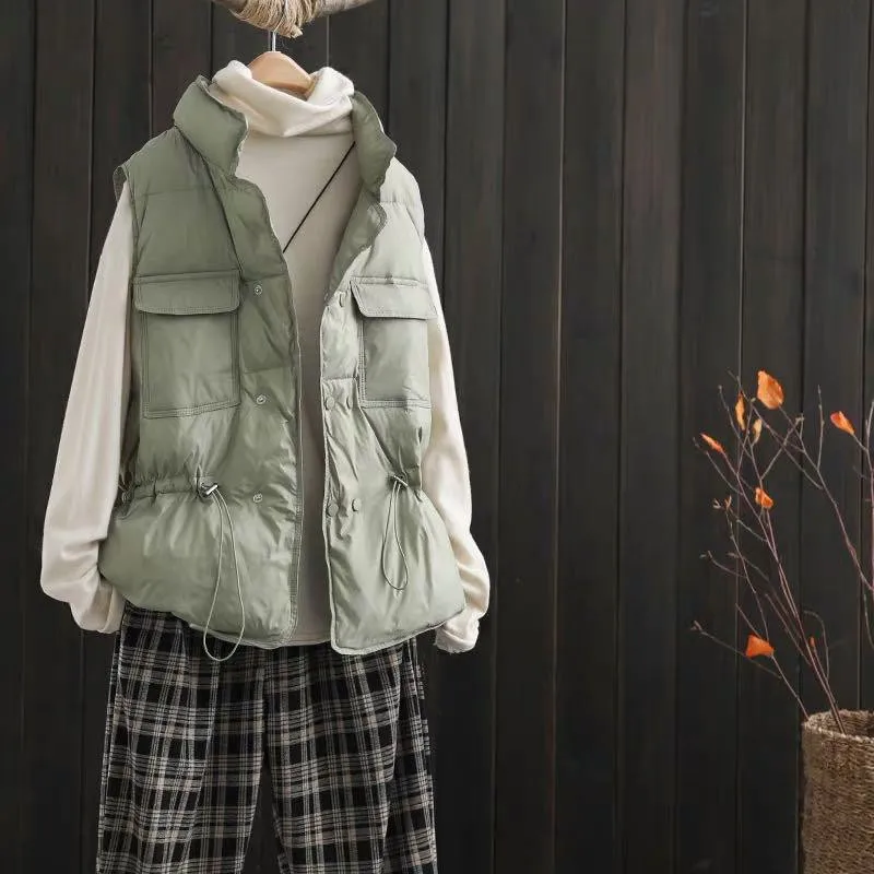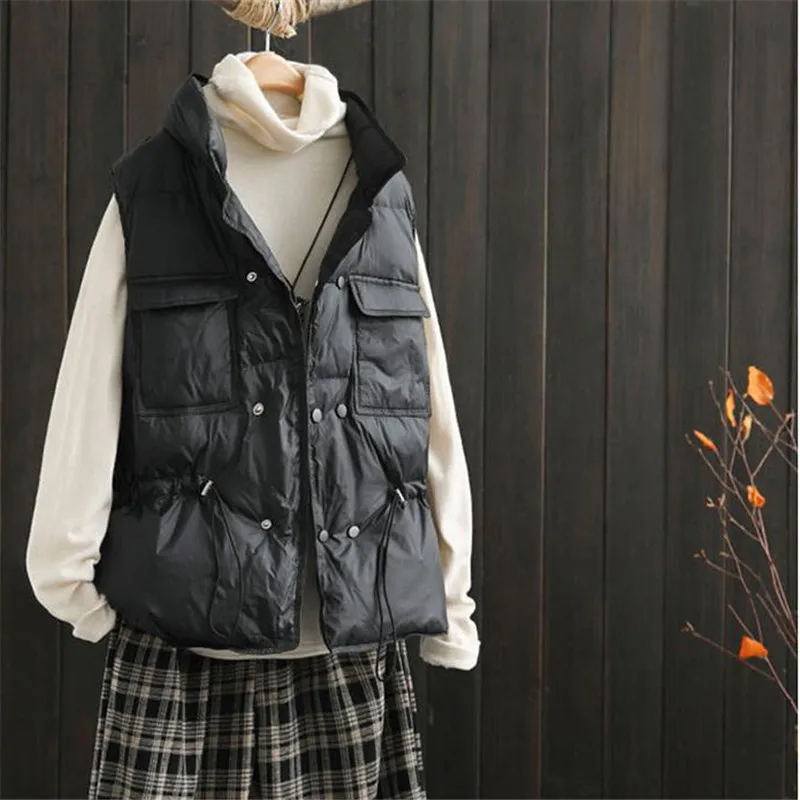 Autumn Winter Oversize Down Waistcoat Jacket Women Drawstring Light White Duck Down Vest Parkas Ladies Sleeveless Warm Tank Coat
