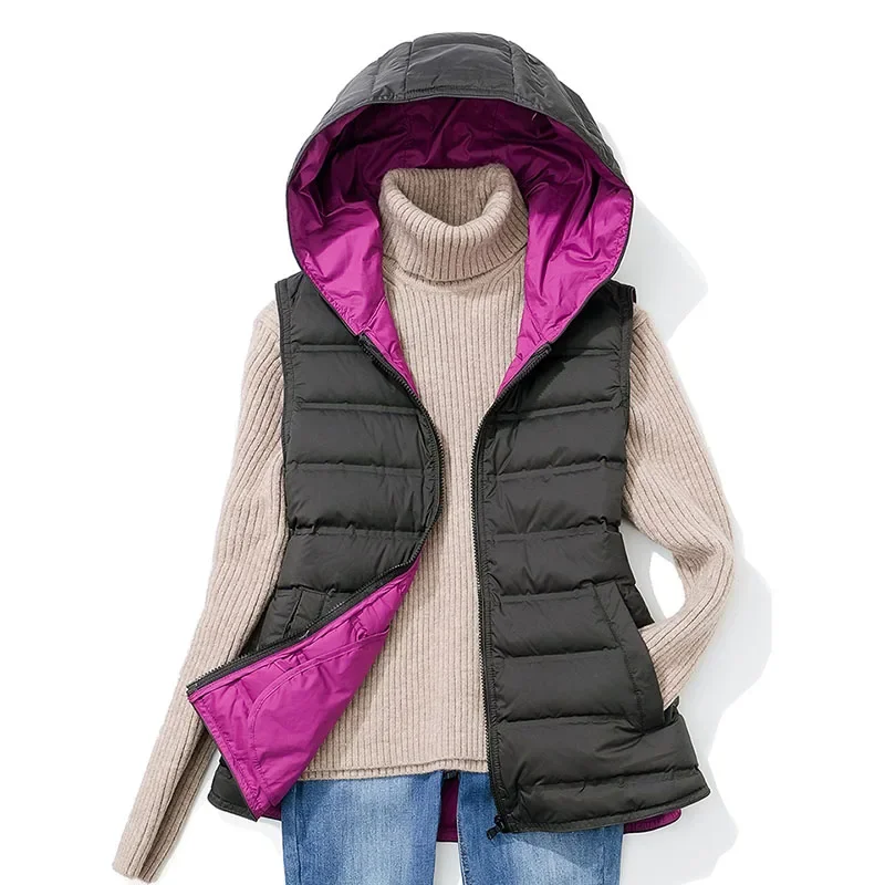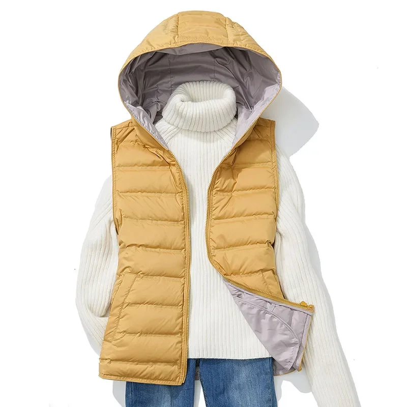 Autumn and Winter Hooded Duck Down Vest Women Short Warm Fashion Slim Jackets Casual Pocket Basic Waistcoat E26