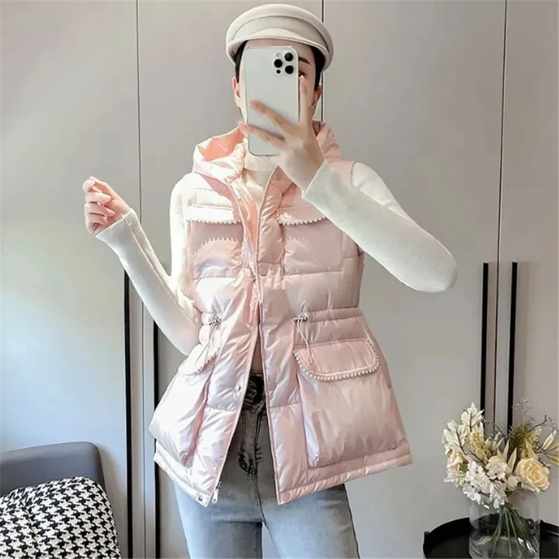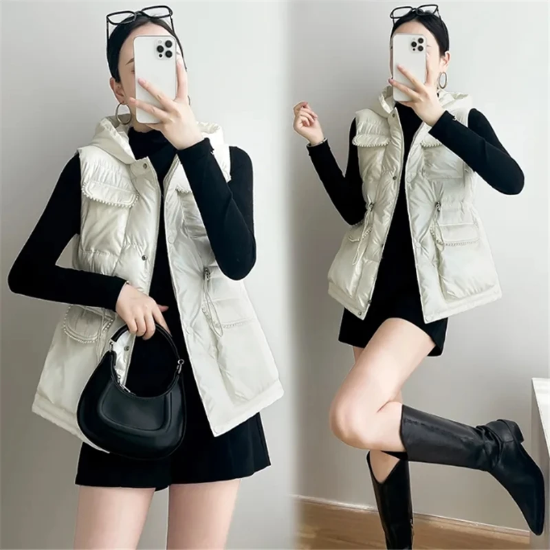 Winter Short Down Cotton Vest Jacket Women 2023 New Hooded Vestidos Coat Fashion Pocket Waistcoat Pure Colour Outerwear Female
