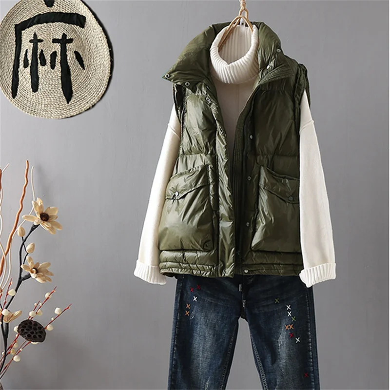 Winter Women Sleeveless Drawstring Down Waistcoat Warm Thick White Duck Down Vest Coat Ladies Short Casual Oversize Tank Jacket