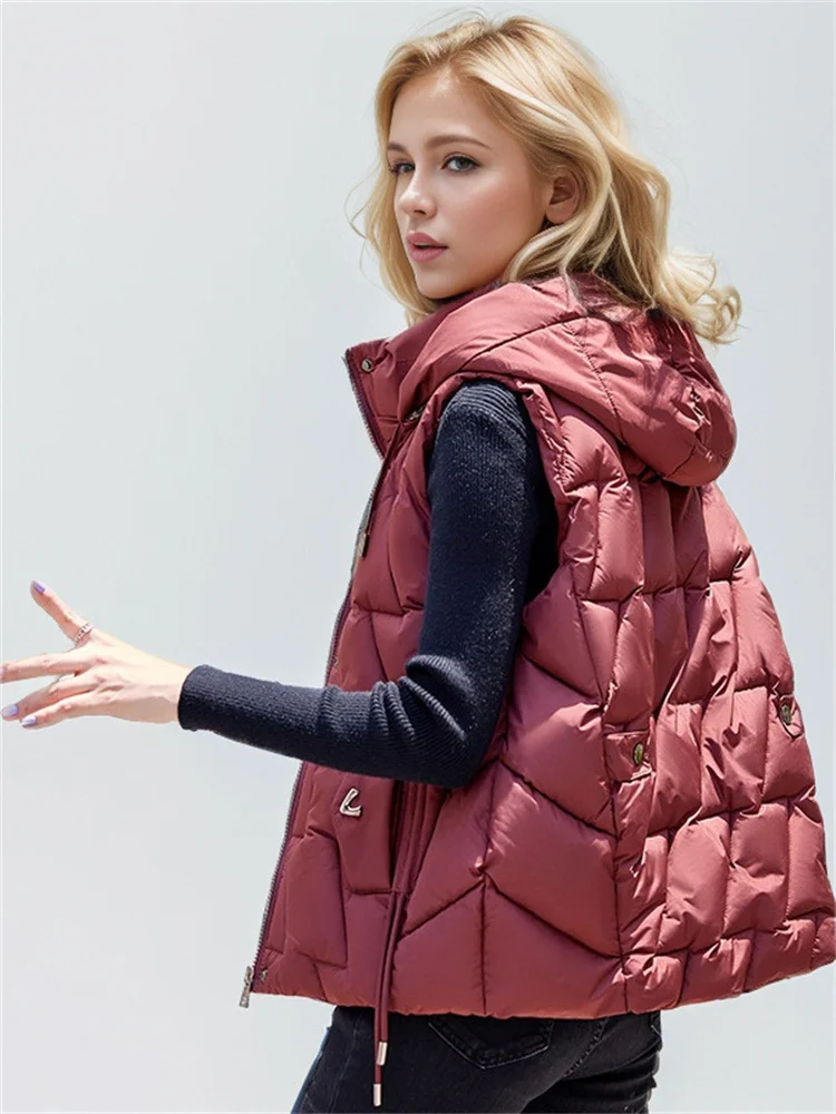 2024 Winter New Down Cotton Vest Jacket For Women Simple Solid Color Fashion Hood Zippered Vest Casual Warm Jacket