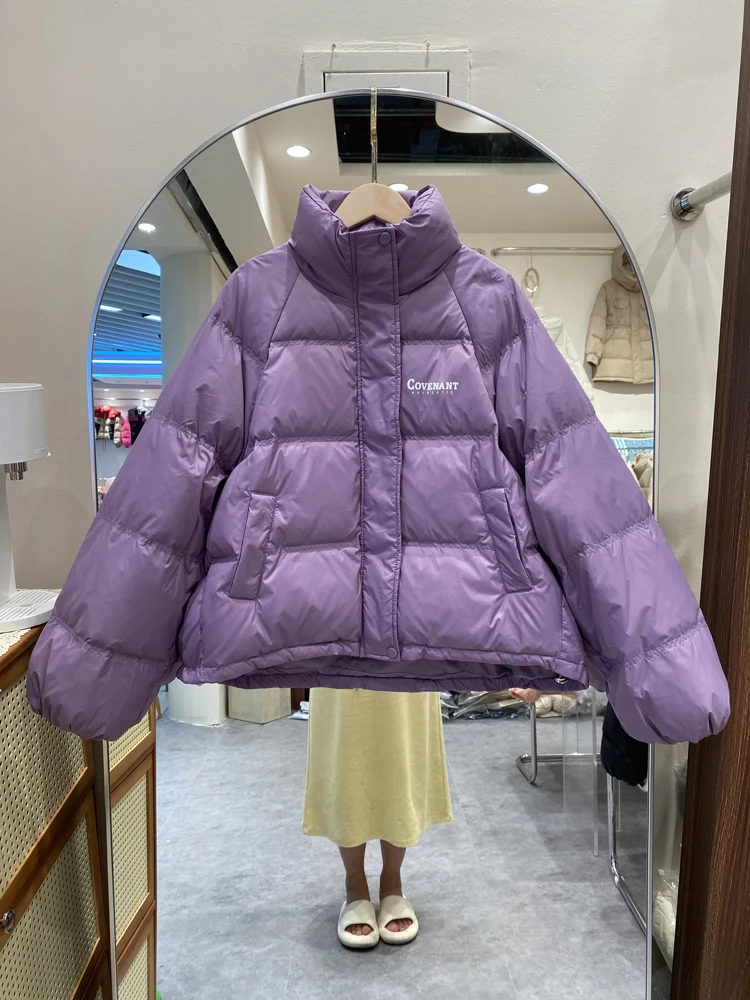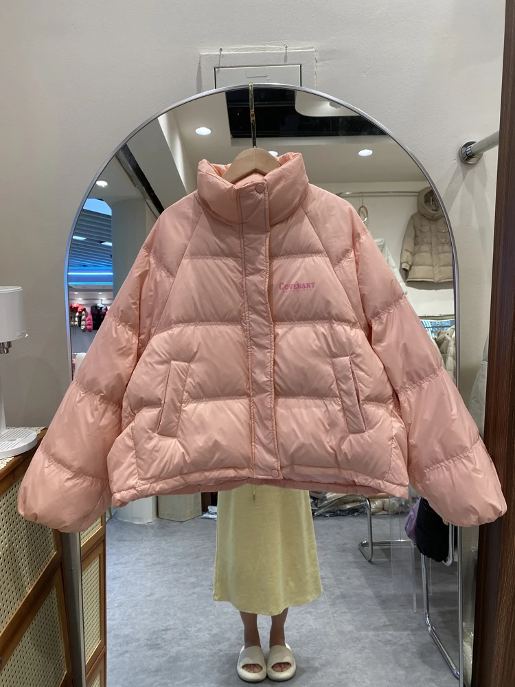 2023 Women Winter Solid Casual Coat Lady Stand Collar Loose Oversize Warm Streetwears Korean Fashion White Duck Down Jackets