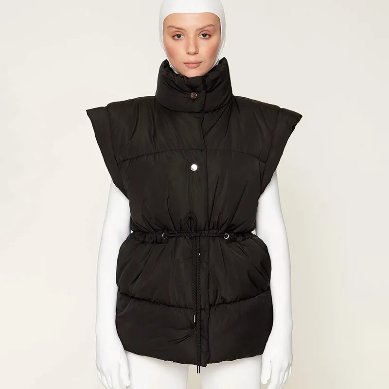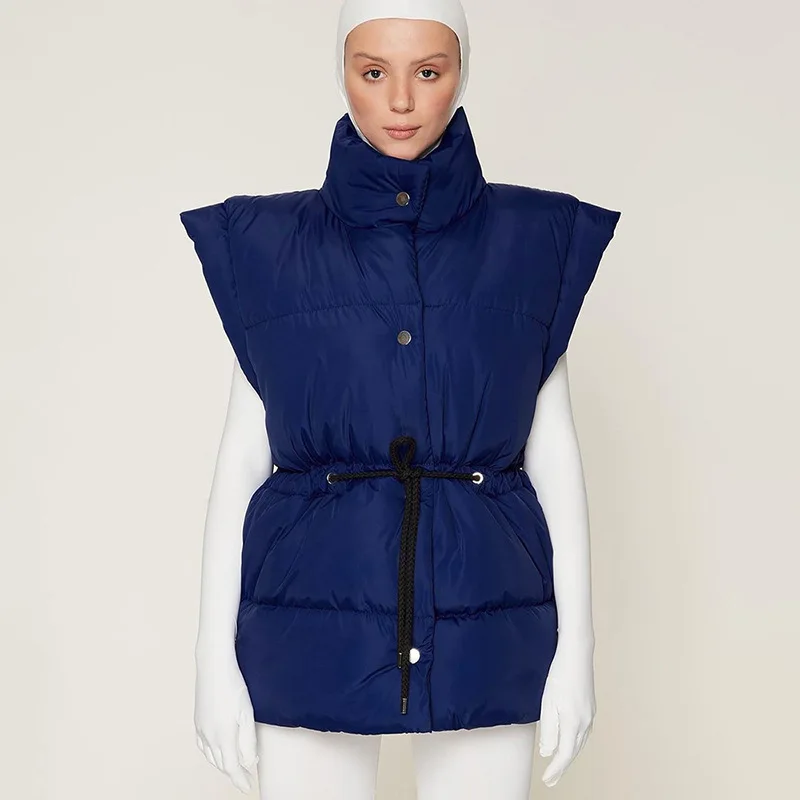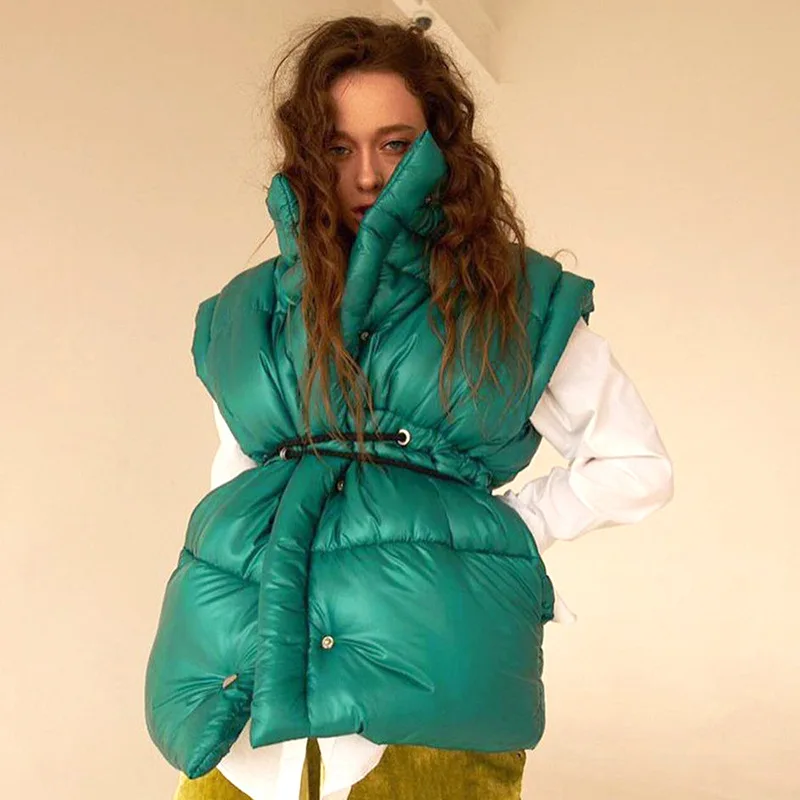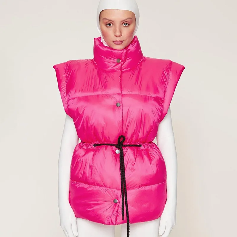 Women Drawstring Waist Pink Long Puffer Jackets Stand Collar Down Coats Vest Sleeveless Bubble Coats Puff Parkas Down Outcoats