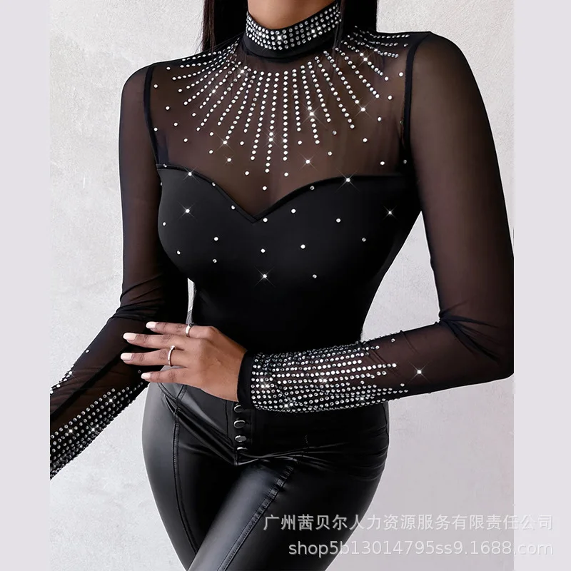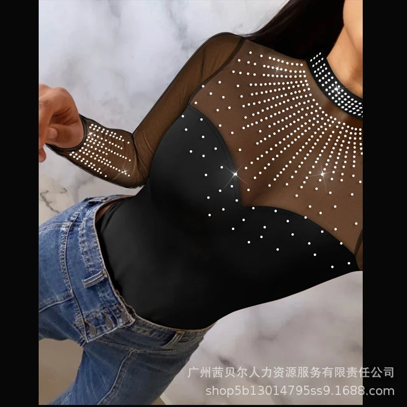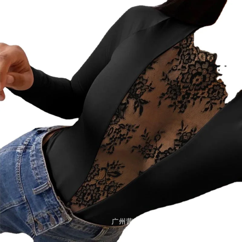 Jumpsuits Women One Piece Sexy Lace Splice Bodysuits Overalls V Neck Full Sleeve Sheer Rompers Solid Slim Fit Ladies Streetwear