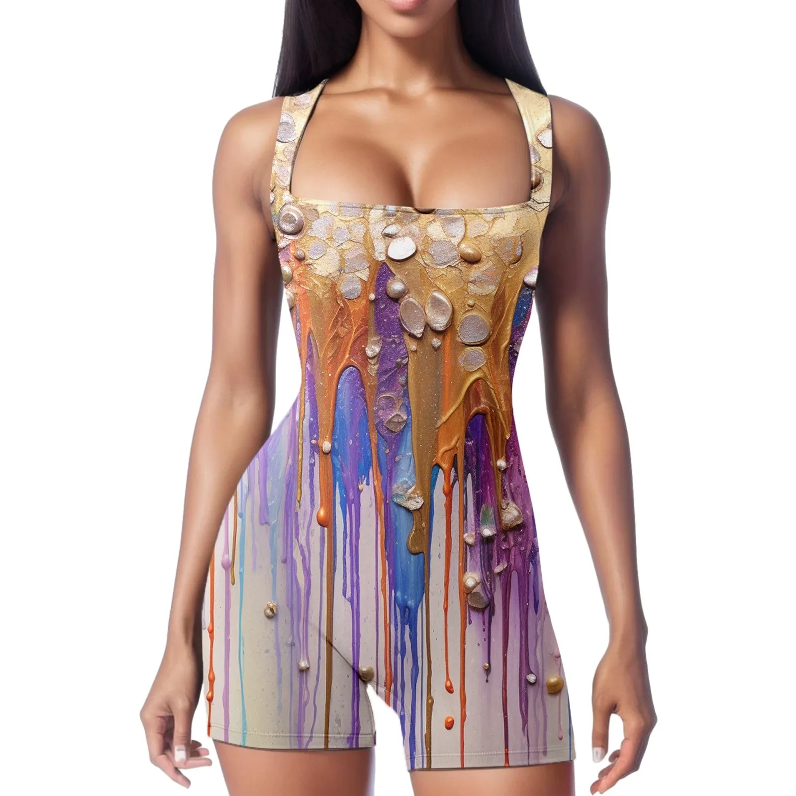 Women's Casual Yoga Rompers Printing Ribeed Workout Square Neck Tank Tops Sleeveless Exercise Jumpsuits Tight Fitting Bodysuit
