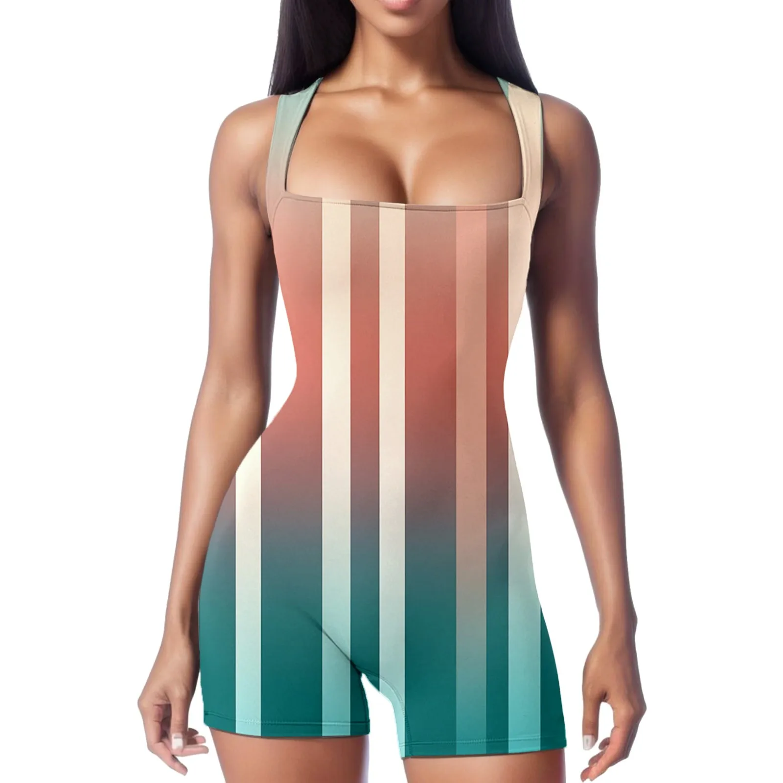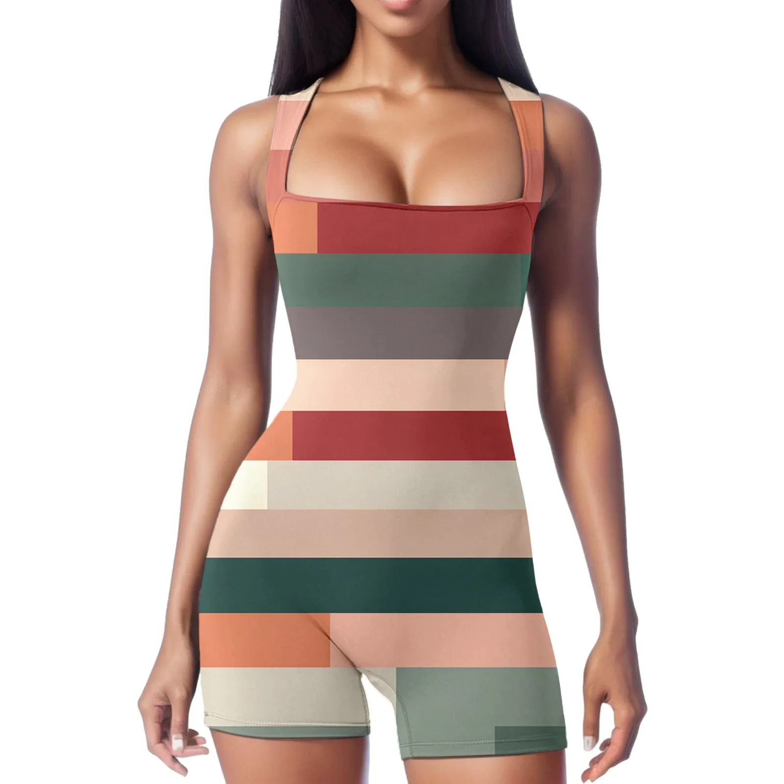Ladies Comfortable Yoga Short Rompers Print Ribeed Workout Square Neck Tank Tops Sleeveless Tight Fitting Exercise Jumpsuits