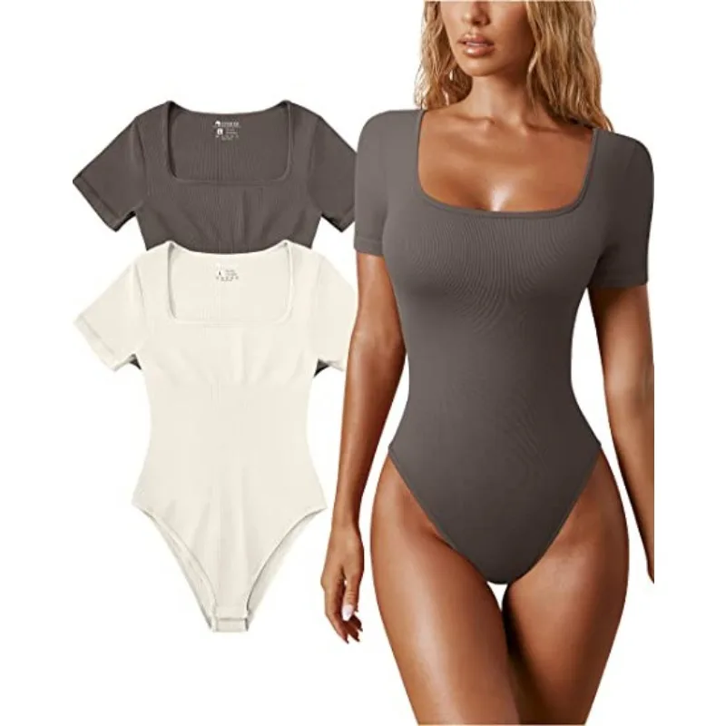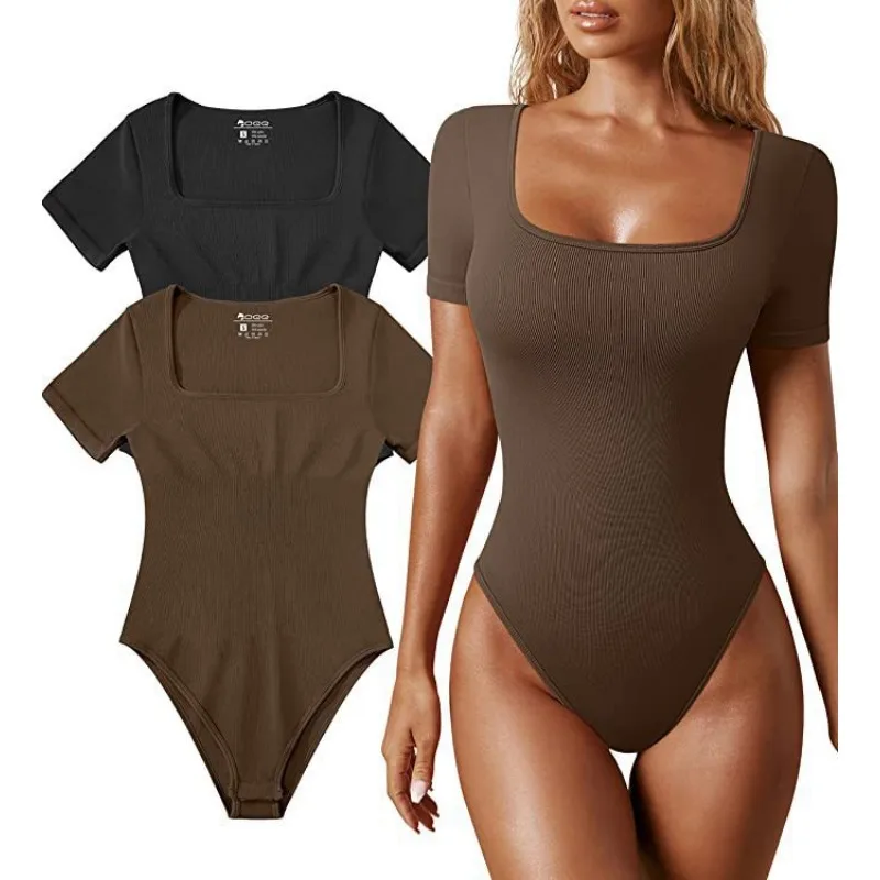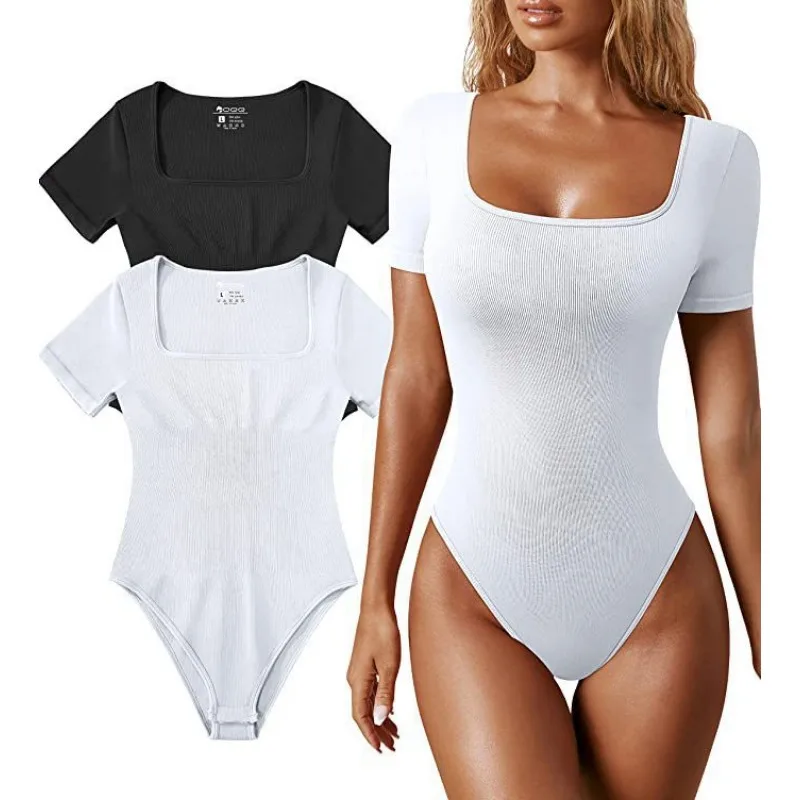 Elegant Casual Fashion Y2K INS Short Sleeve Square Collar High Waist Slim Fit Romper Onepieces Summer Sexy Corset Bodysuit Top