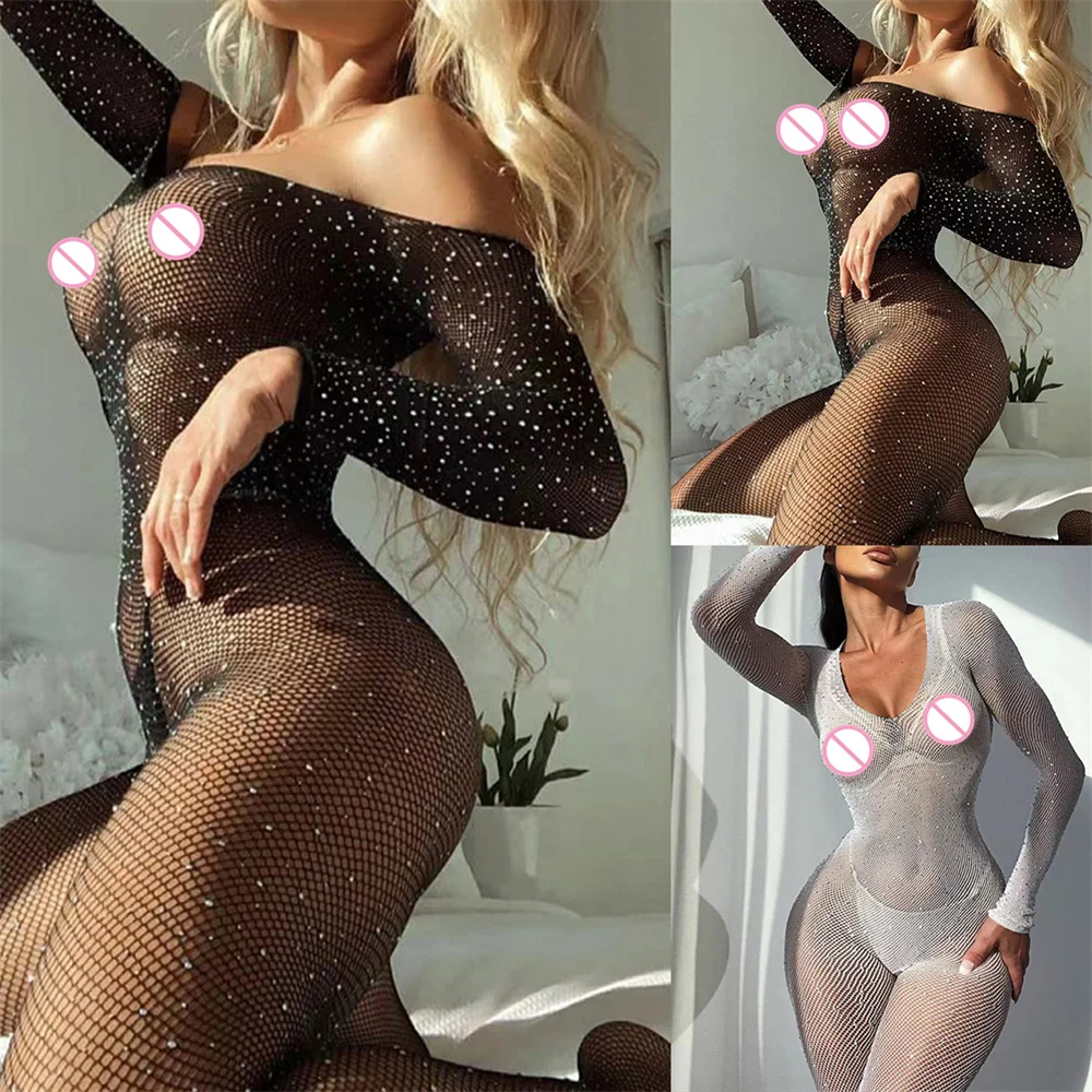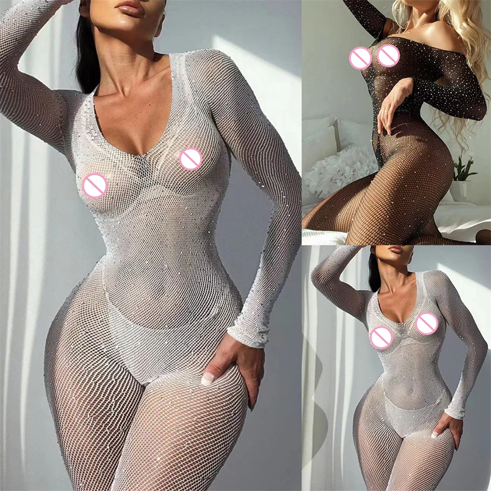 Name | Women's Sexy Bodysuit Elastic Lingerie Bodystocking Hollow Rhinestone Crystal Jumpsuits Shinny See Through Underwear |