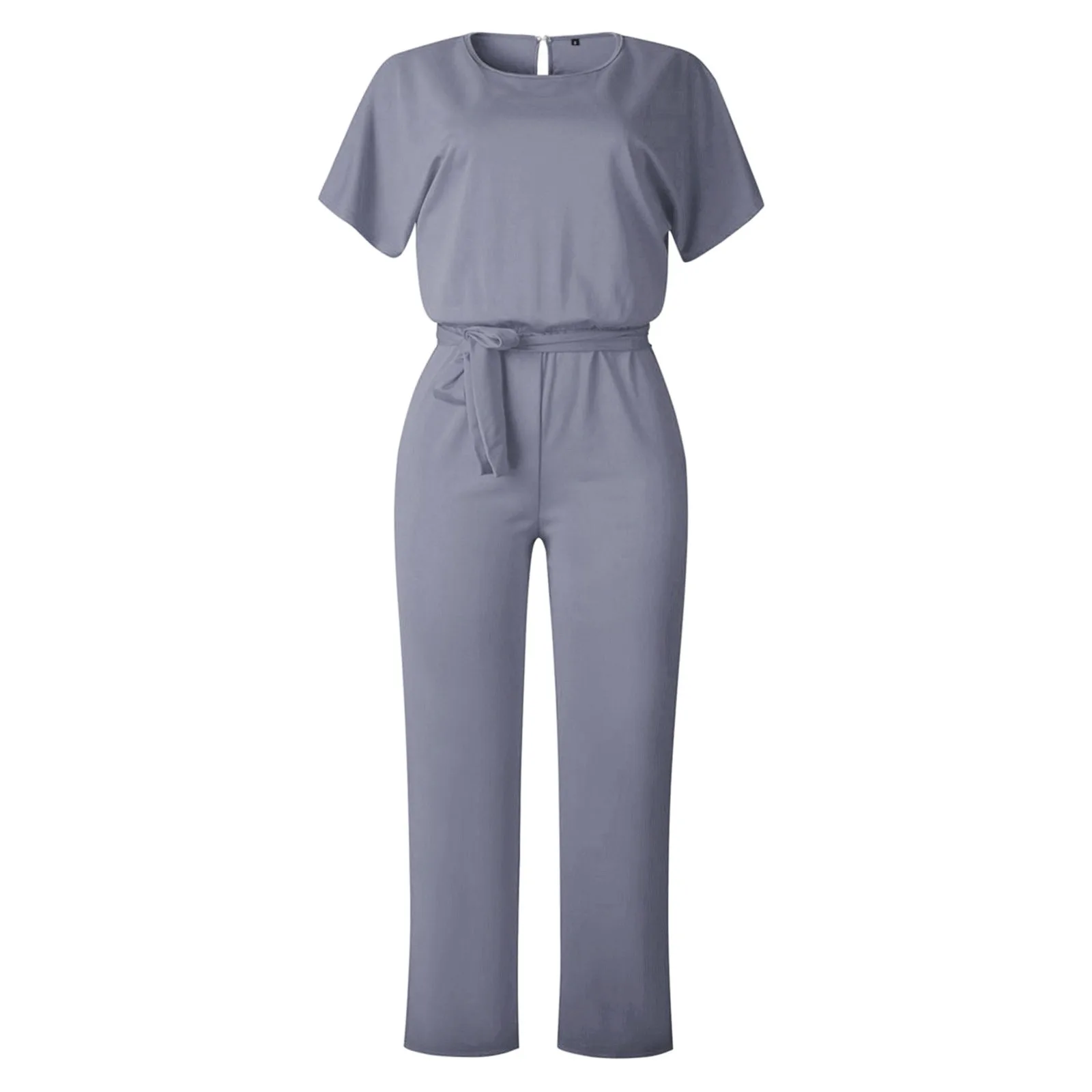Women's Fashion Solid Color Lace Up Button Temperament Jumpsuits Round Neck Short Sleeved Loose Wide Leg Pant Bodysuits