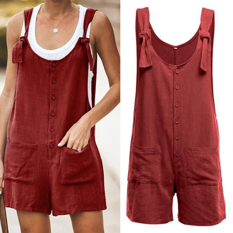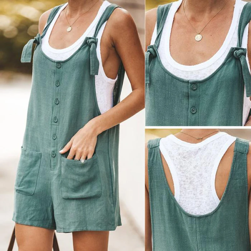 1pcs Summer Fashion New Cotton And Linen Lace-up One-piece Straps Solid Colored Buttons Comfortable Casual Women's Shorts