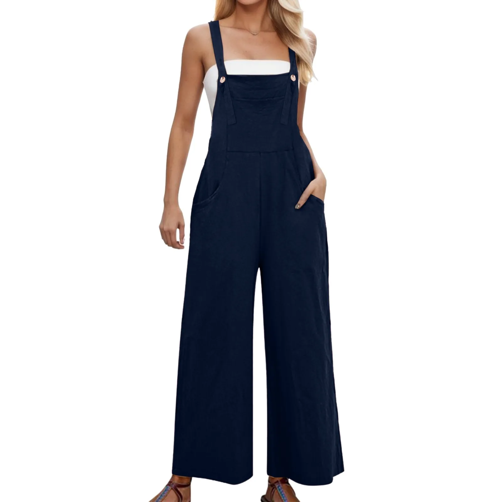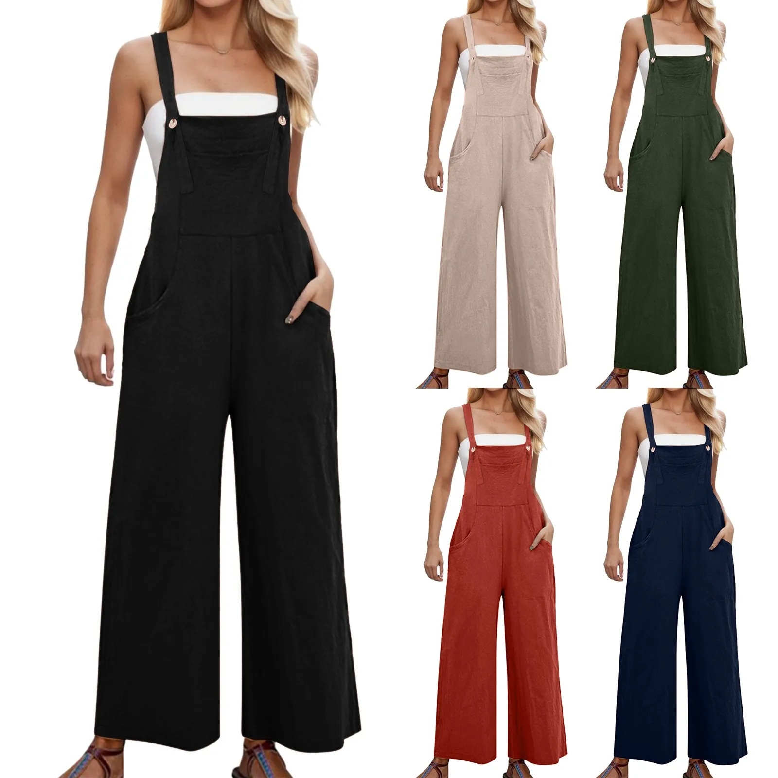 Women's Loose Sleeveless Jumpsuits Adjustable Suspender Stretchy Long Pants Casual Solid Color Wide Leg Romper With Pockets