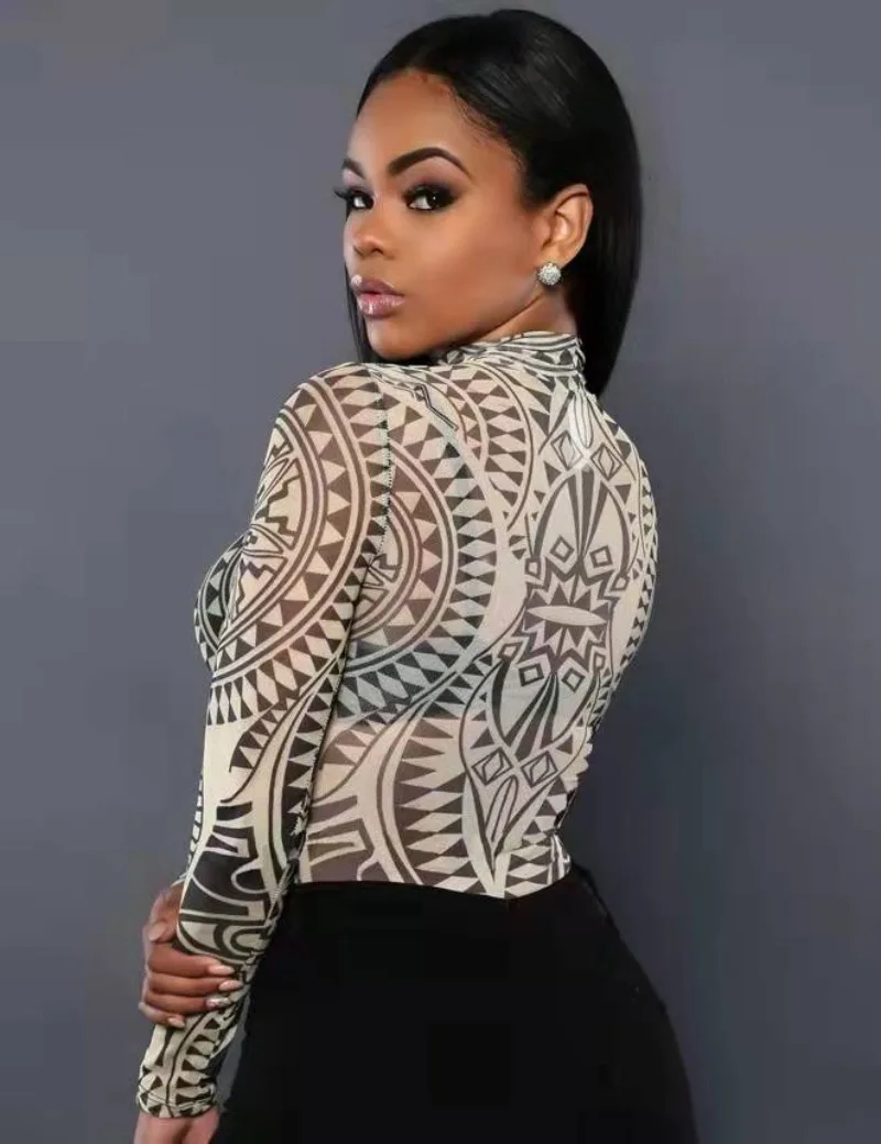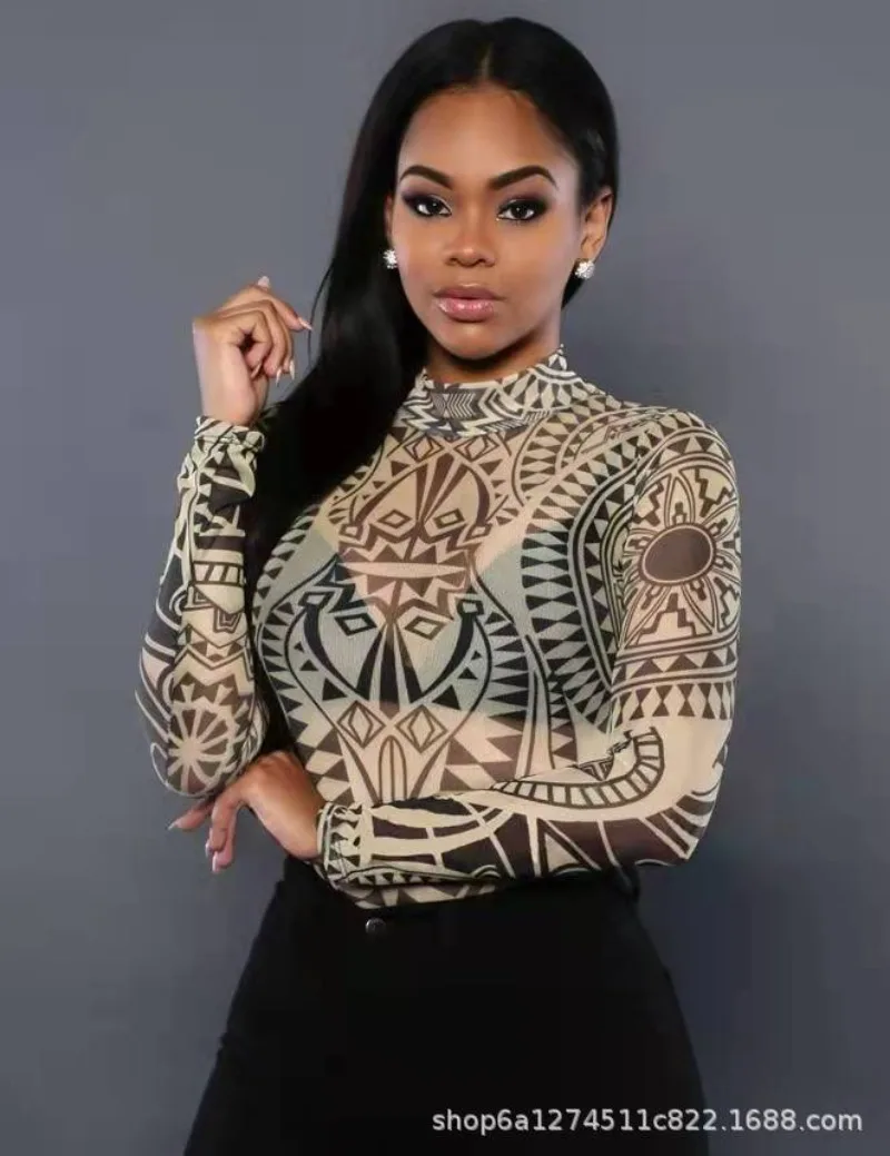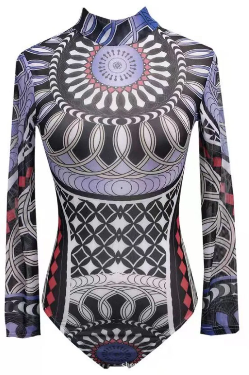 Womens Romper Mesh Pattern Printed Top Sexy Slim Fitting Jumpsuit for Women Bodysuit