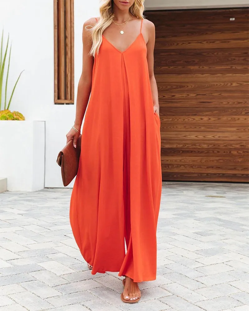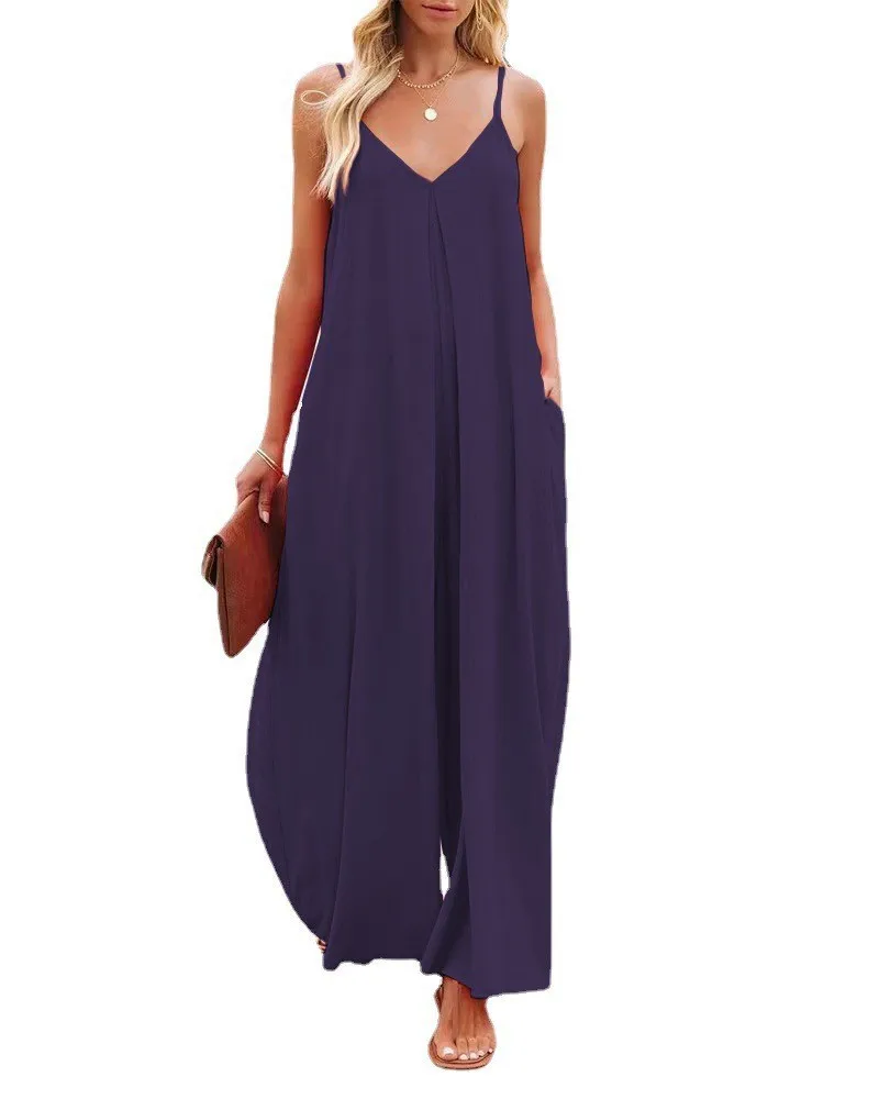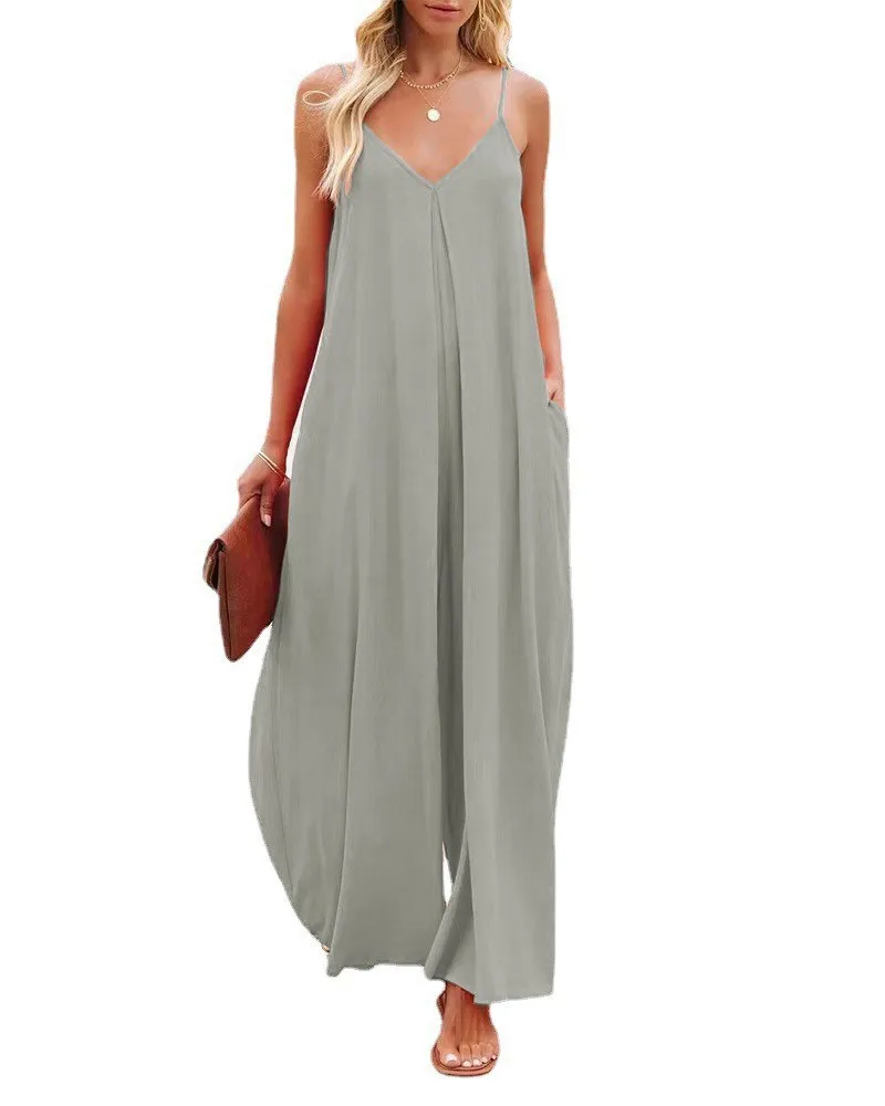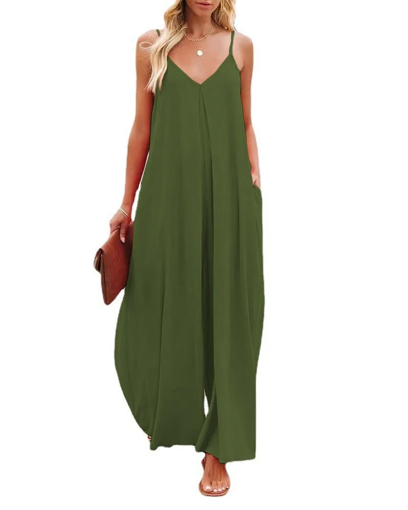 Women Jumpsuits V Neck One Piece Ankle Length Wide Leg Pants Rompers Backless Overalls Solid Pockets Loose Casual Mid Waist