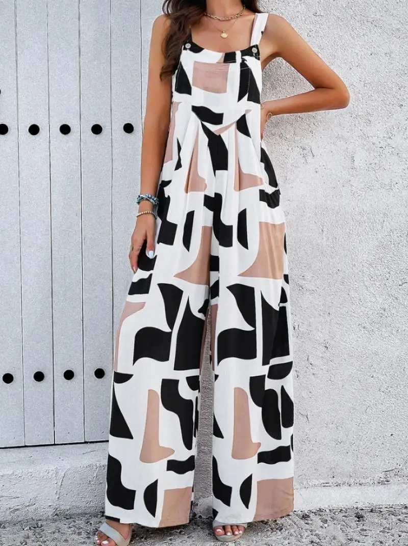 Casual Women's Summer Camisole Jumpsuit Abstract Line Printed Pocket Loose Wide Leg Jumpsuit 2024 Elegant Daily Women's Jumpsuit