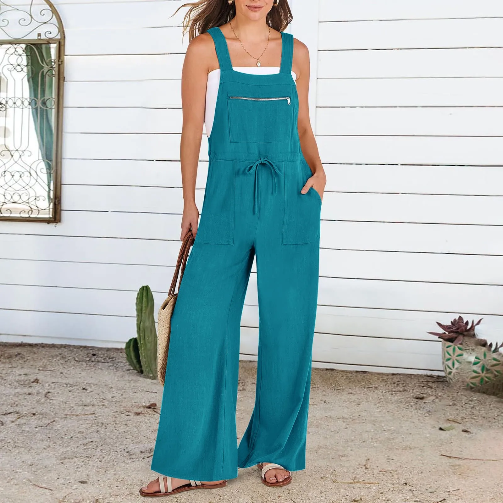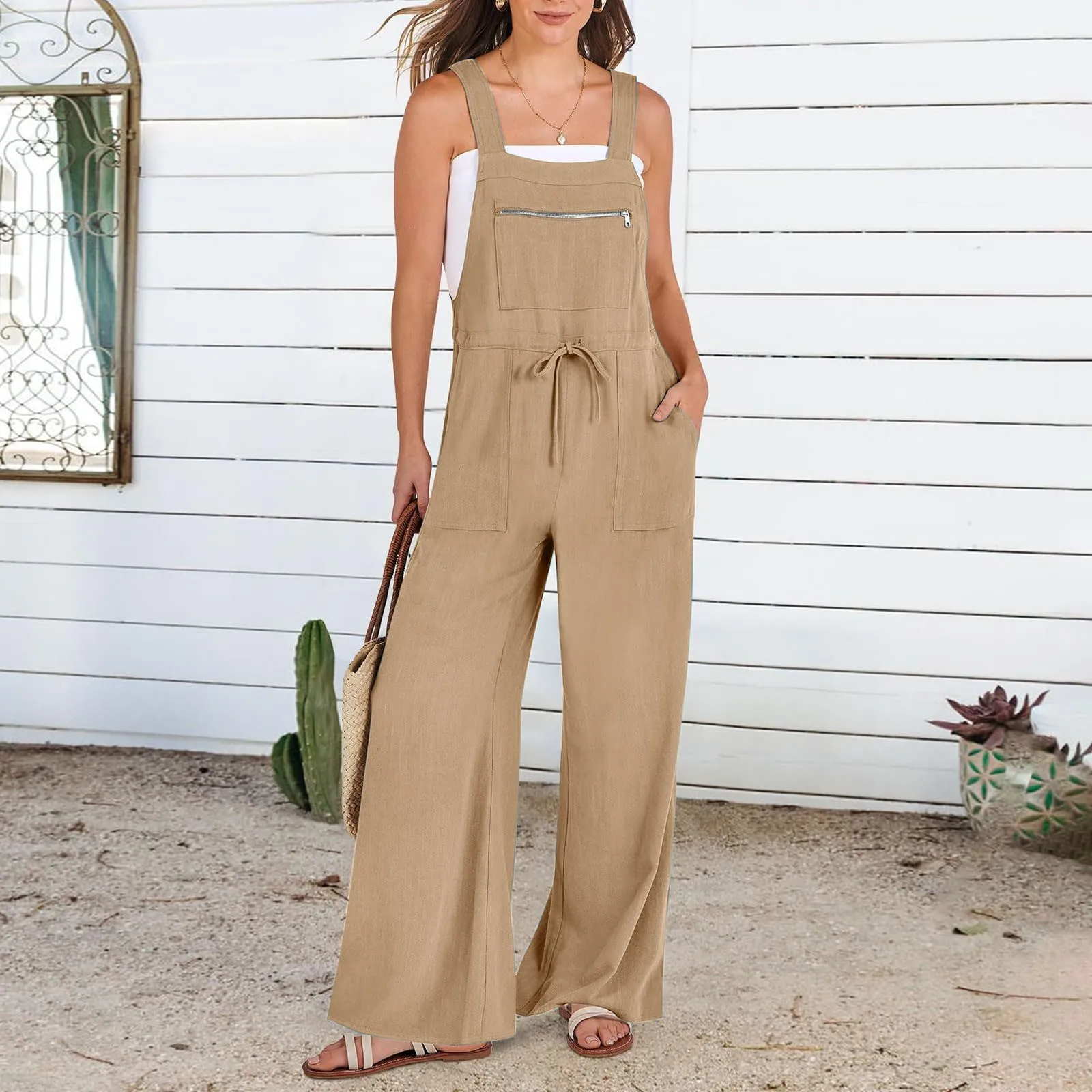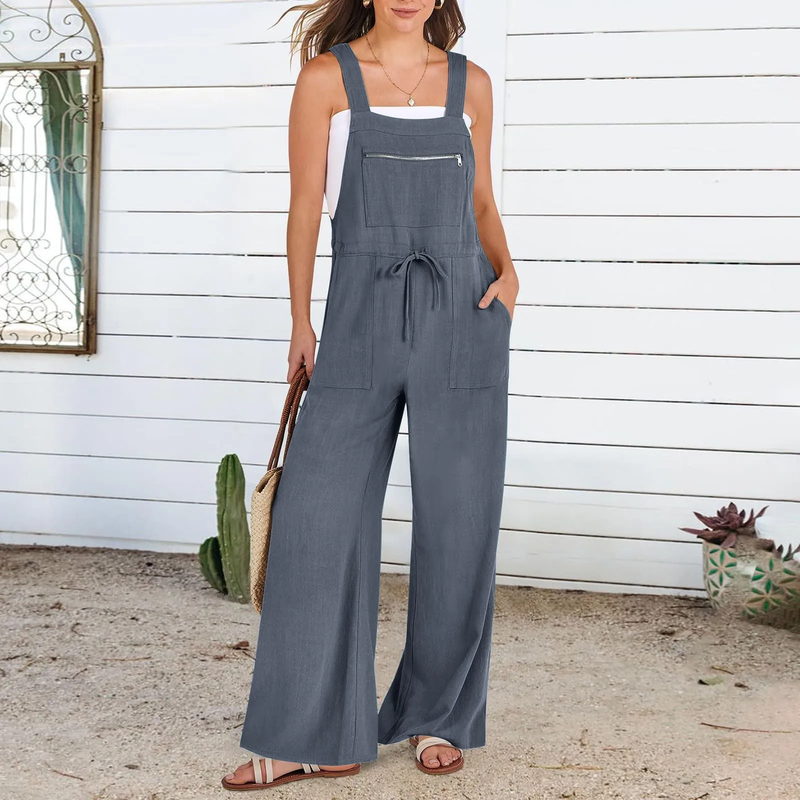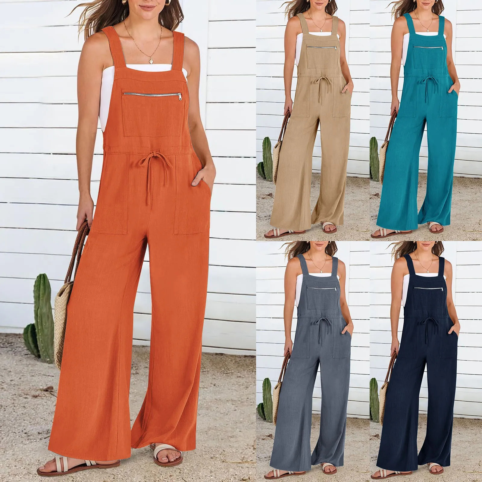 Women Summer Cotton Linen Playsuit Fashion Sleeveless Wide Leg Pencil Solid Long Rompers Casual Comfortable Casual Jumpsuit