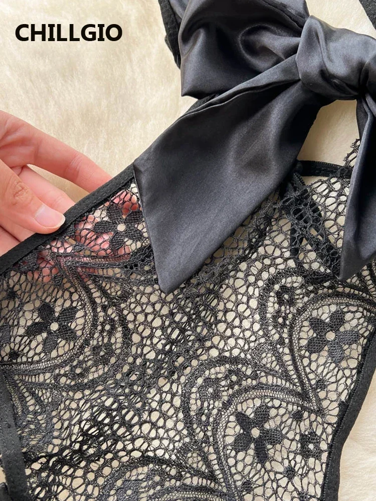 CHILLGIO Women Floral Transparent Cheongsam Lace Bodysuits Halter Sheer Bow Erotic Catsuit Hollow One Piece Combination Rompers