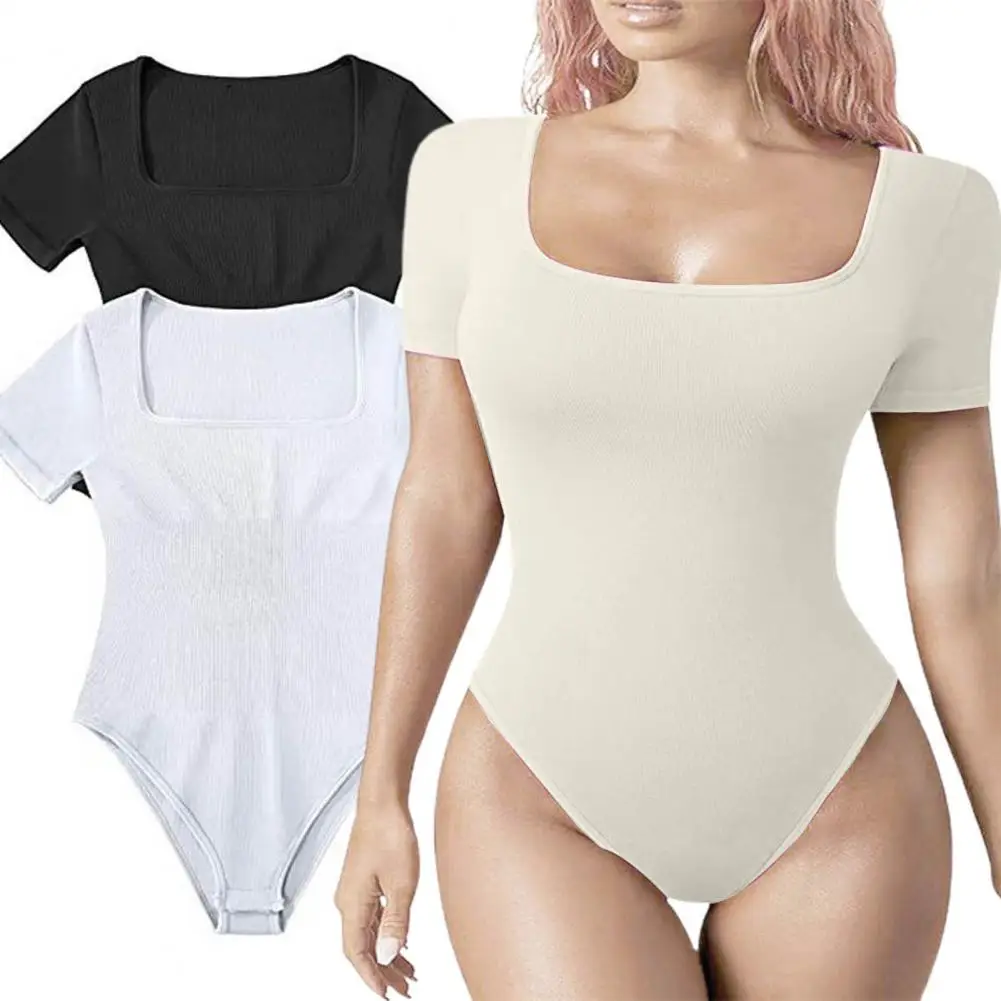 Short Sleeve Bodysuit High Elasticity Women's Summer Bodysuit with Tummy Control Square Neck Short Sleeves Playsuit for Lady