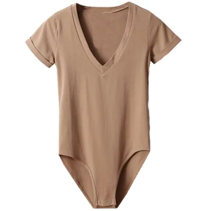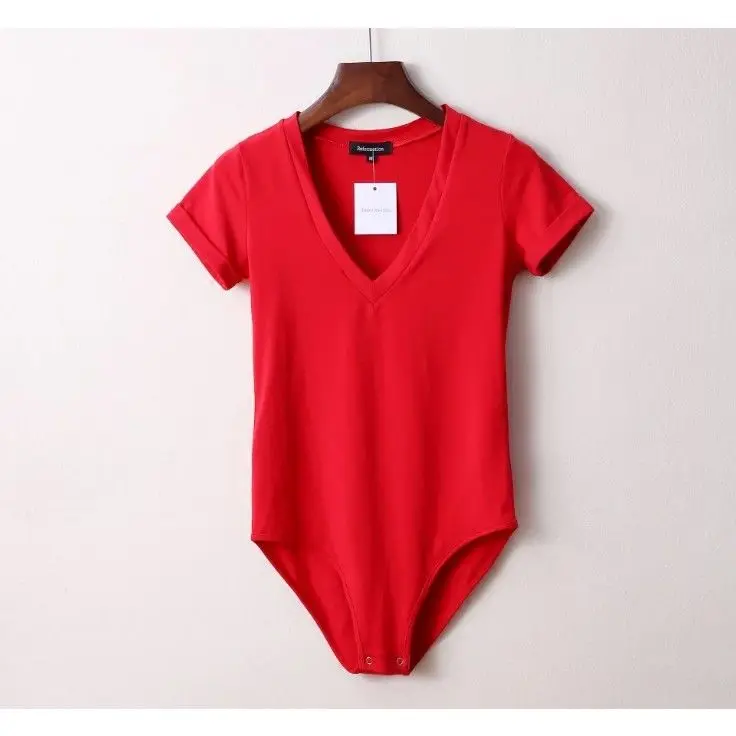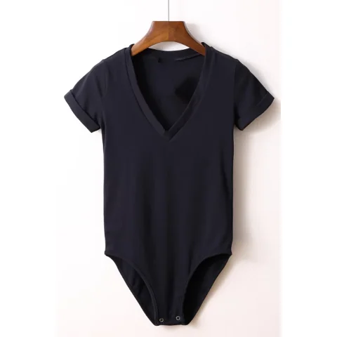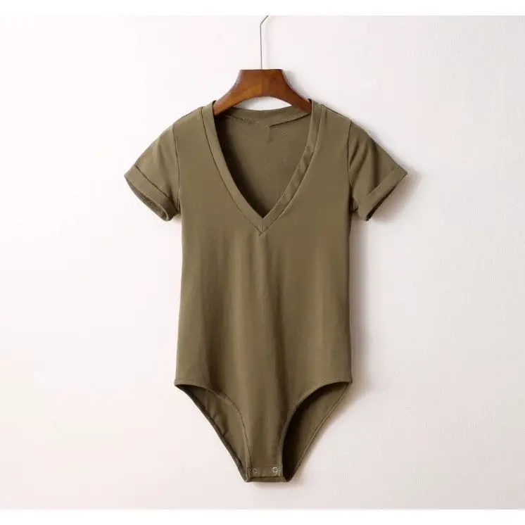 Fresh Sweet Women's Big V-Neck Short Sleeve Bodysuit Romper in Solid Color Stretch Playsuit for Summer