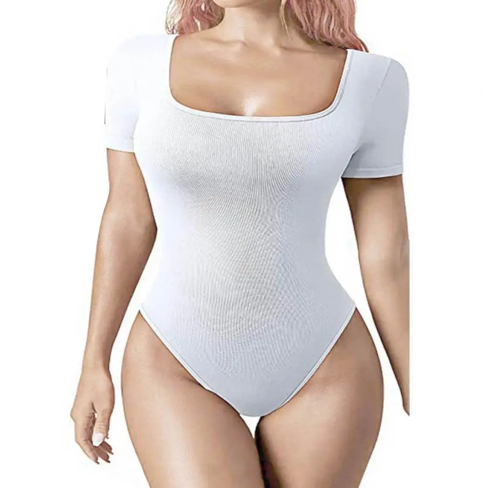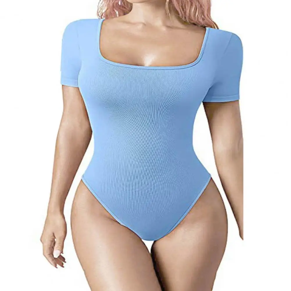 Lady Playsuit Short Sleeve Bodysuit High Elasticity Women's Summer Bodysuit with Tummy Control Skinny Fit Square Neck Short