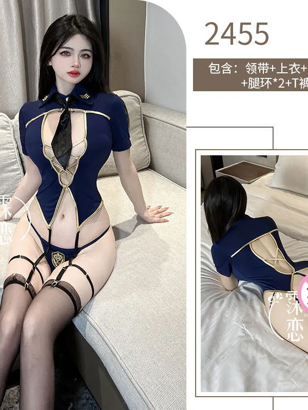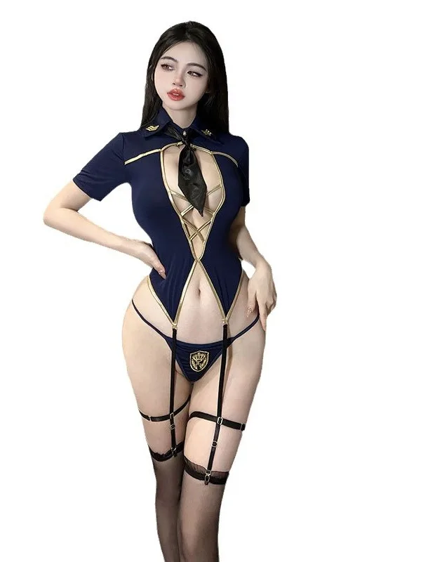 New Women's Clothing For Spring And Summer Jumpsuit Navy Blue Short Sleeved Hollowed Out Top Black Suspender Socks Slim I9O2