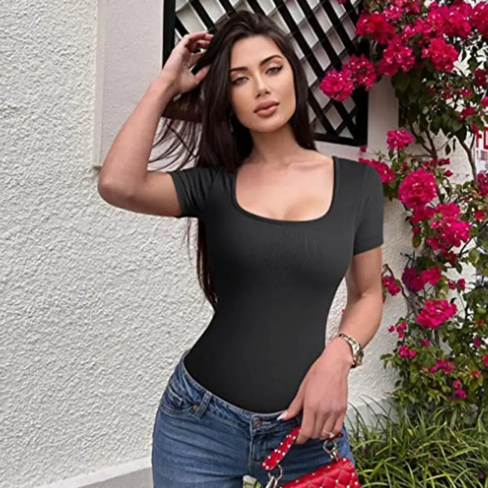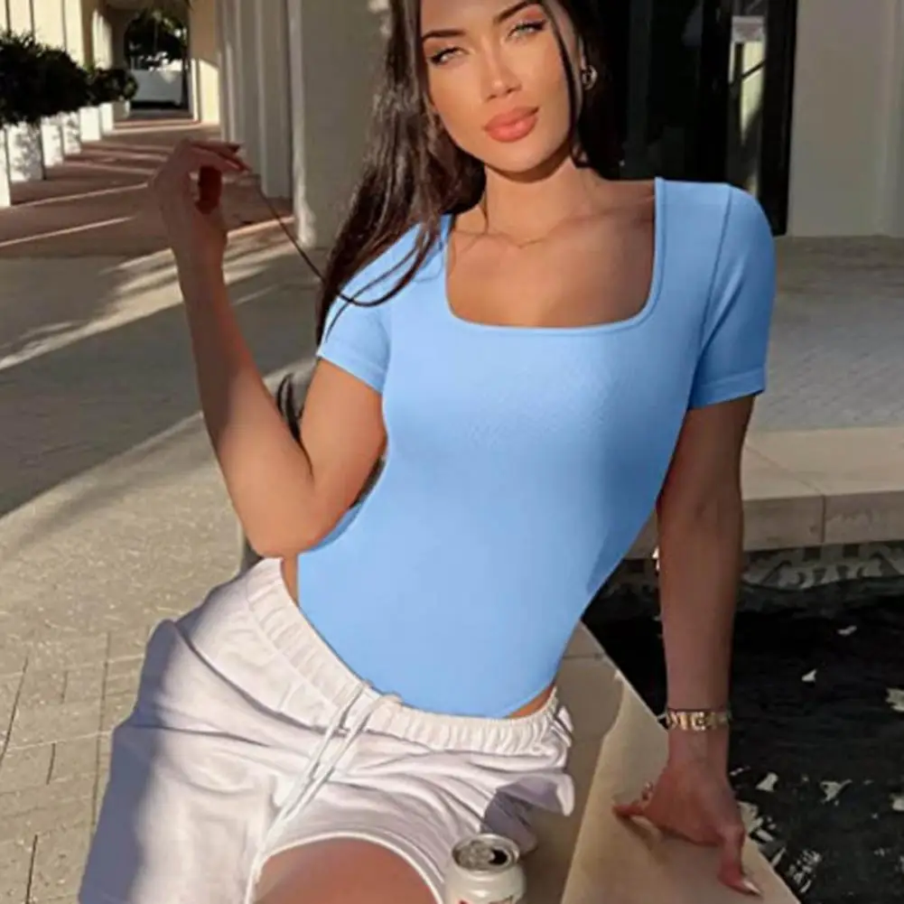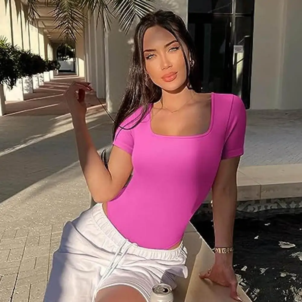 Summer Women Bodysuit Solid Color Square Neck Short Sleeves Playsuit High Elasticity Thread Tight Waist Tummy Control Bodysuit
