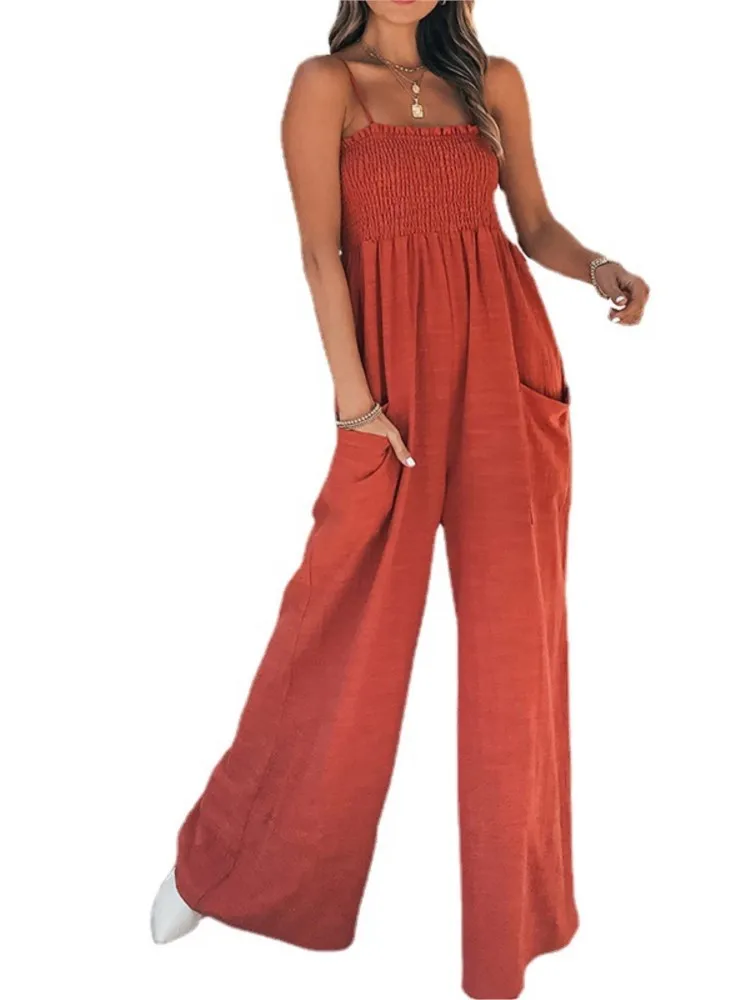 Summer New Women's Solid Color Sexy Sleeveless Camisole Pleated Casual Temperament Commuting High Waistband Pocket Jumpsuit