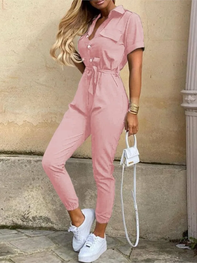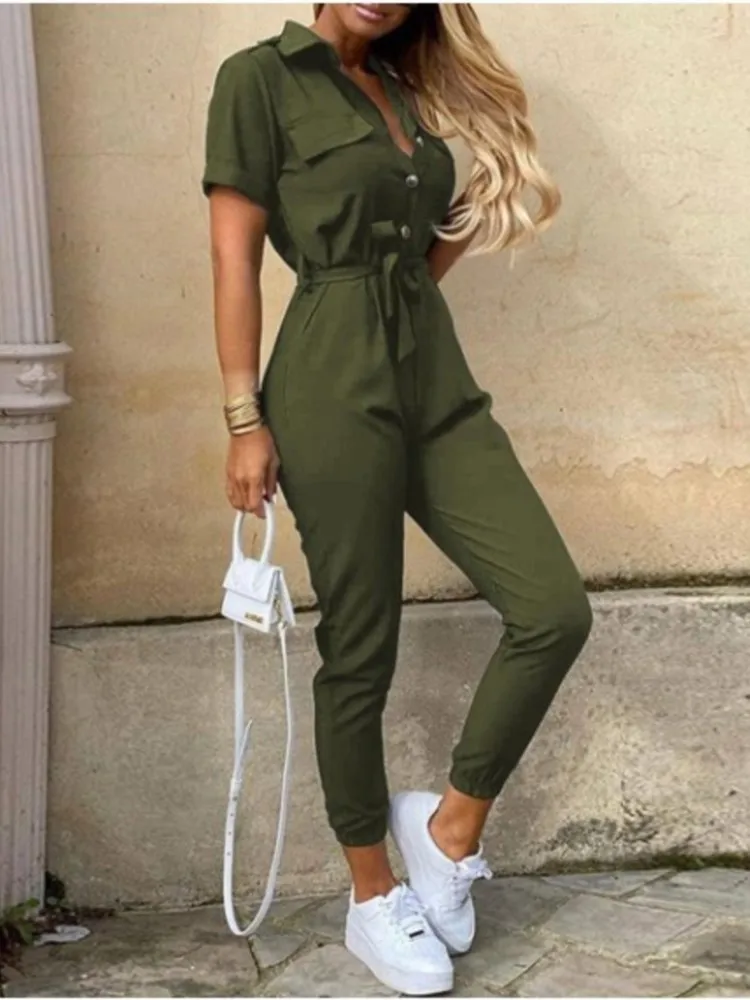 Name | 2024 Spring Summer New Women's Clothing Casual Short Sleeve Collar Fashion Printed Button Strap Waist Strap Work Pants Pants |